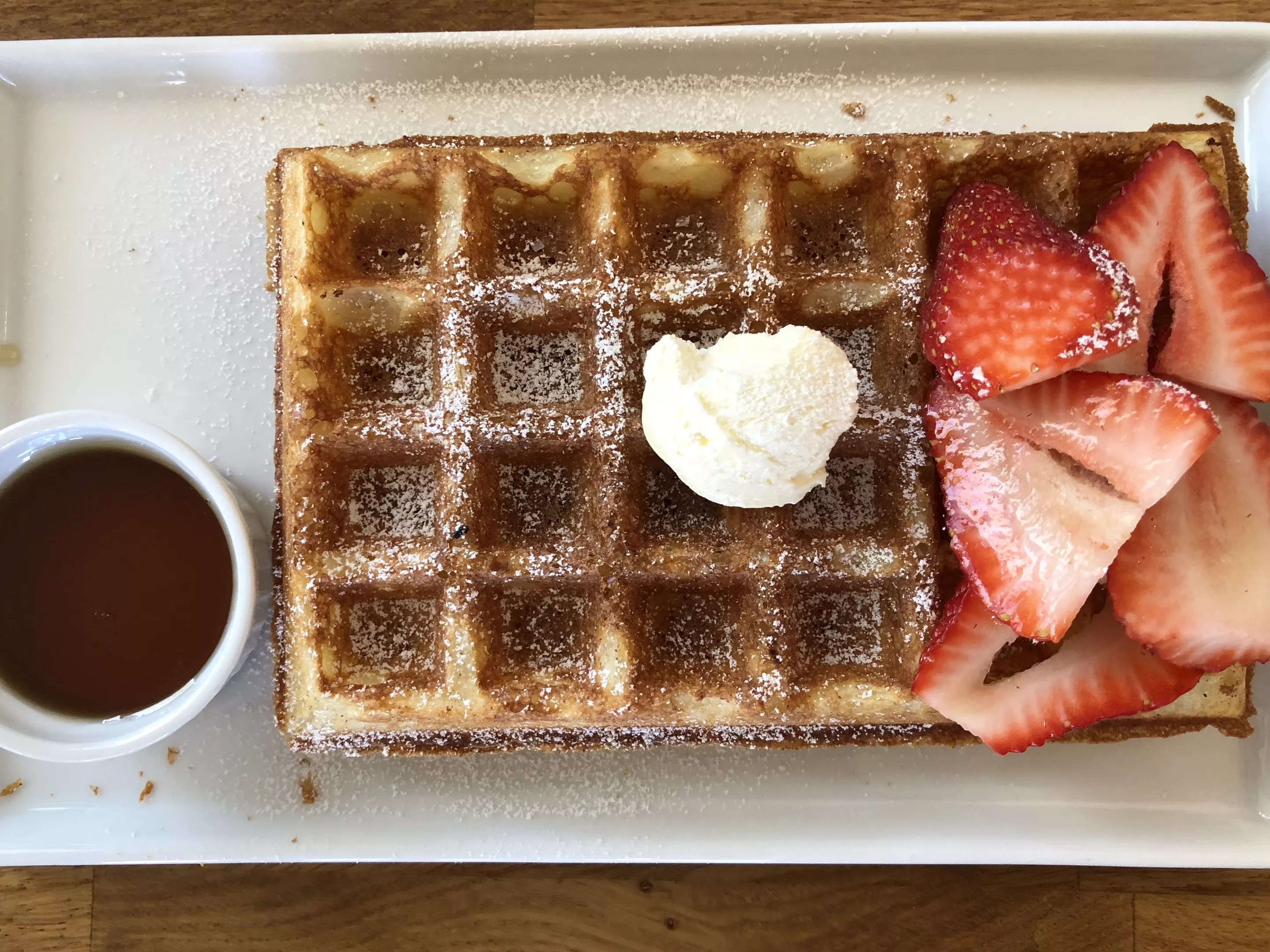 A yeast-risen waffle has an unusual, eye-catching rectangular shape. There’s a scoop of butter in the middle and berries on one side. This waffle has a huge shatter. The crust is lacy and crisp, and the warm dough inside is airy and light. You can have chocolate drizzled on if you want.