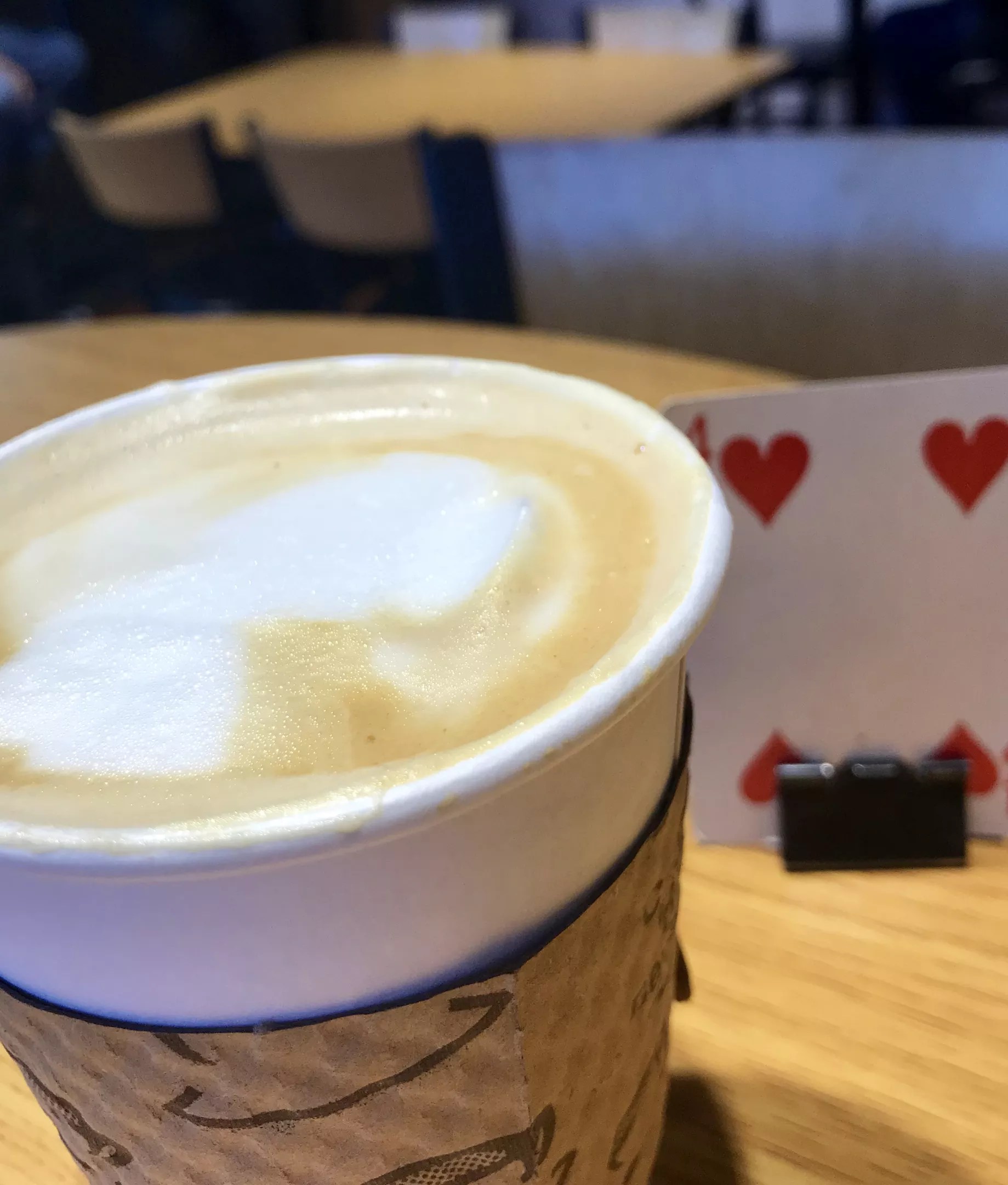 A lavender mocha latte, courtesy of The Refuge. The playing card and binder clip are your calling card to pick up that burrito you’re craving.