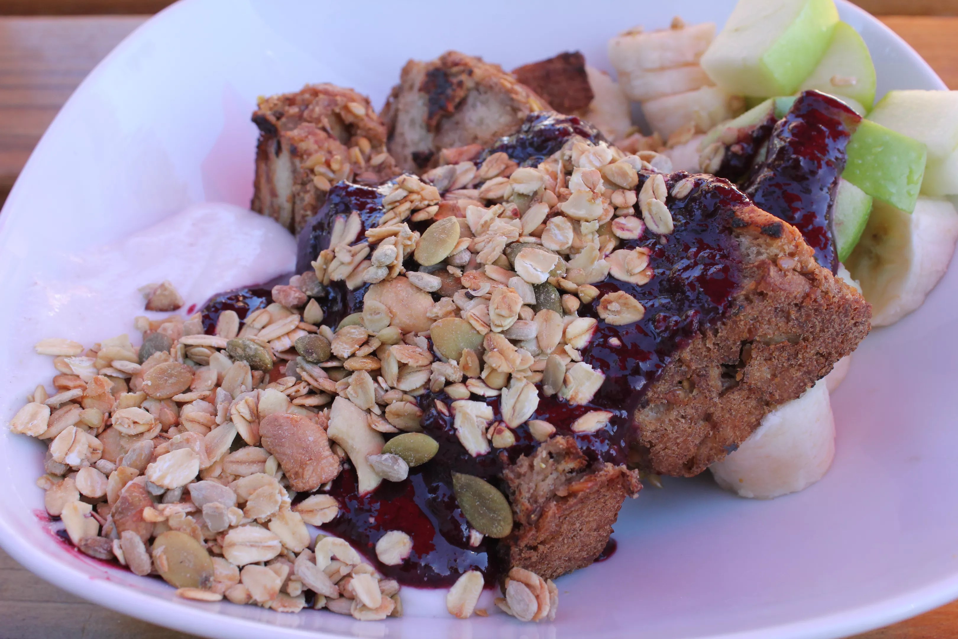 If you’re into French toast, Uprooted Kitchen’s take is a must. Uprooted transforms Proof Bread sourdough into French toast using a bake rather than a sizzle. This creates lightness, and all the other ingredients keep to this baseline. Blueberry preserves flood down the slices. Granola comes thickly. Coconut yogurt and fruit heap on the bowl’s sides. The parts are great, and so is their sum.
