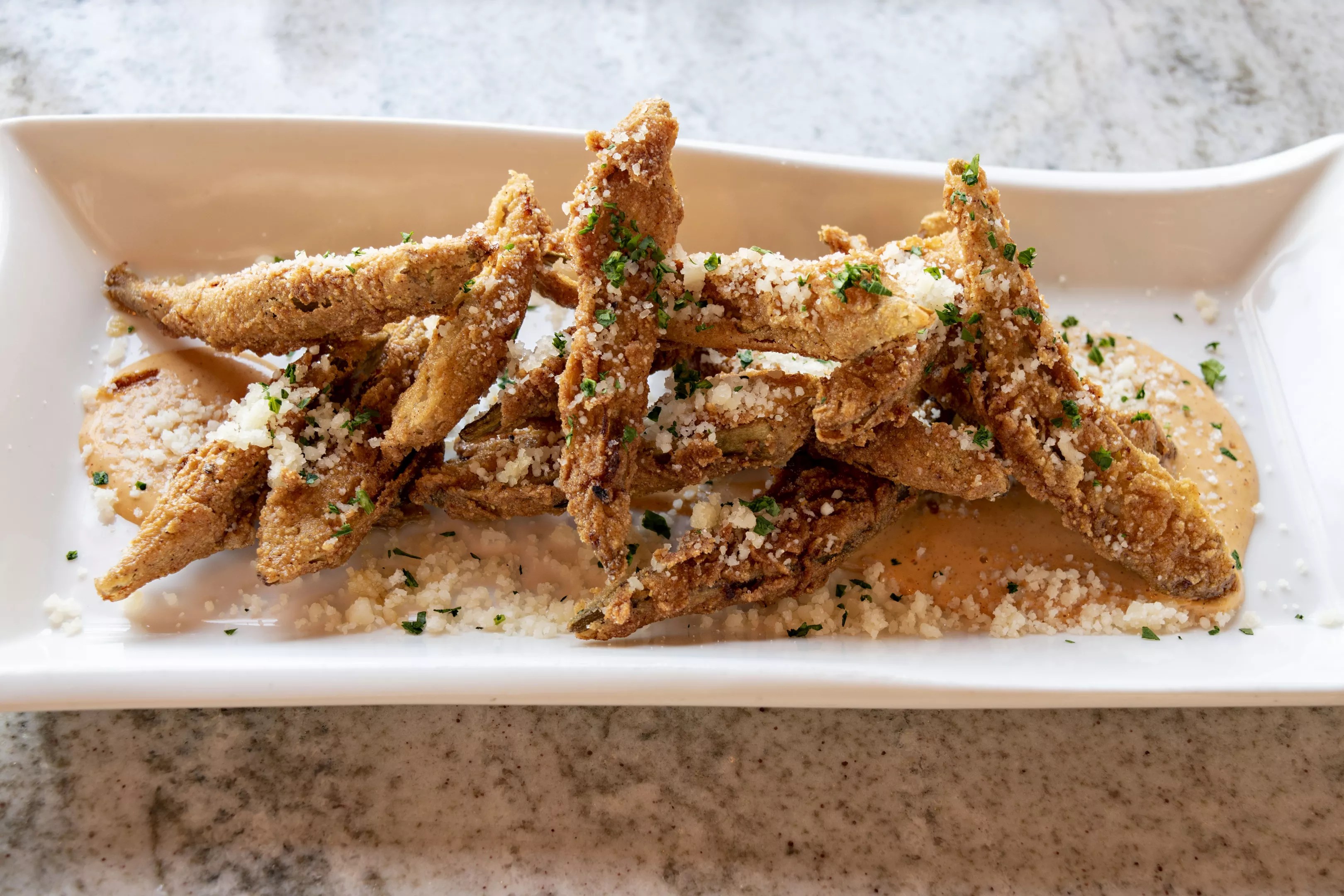 Okra is different. The Dwights pickle and fry red okra from Crooked Sky Farms. Seasoned in the same rub they use for capicola (wait for it!), breaded partly in semolina flour, the shatteringly crisp golden lengths tumble across the plate like a spilled quiver of darts. You don’t even need the yellow remoulade.