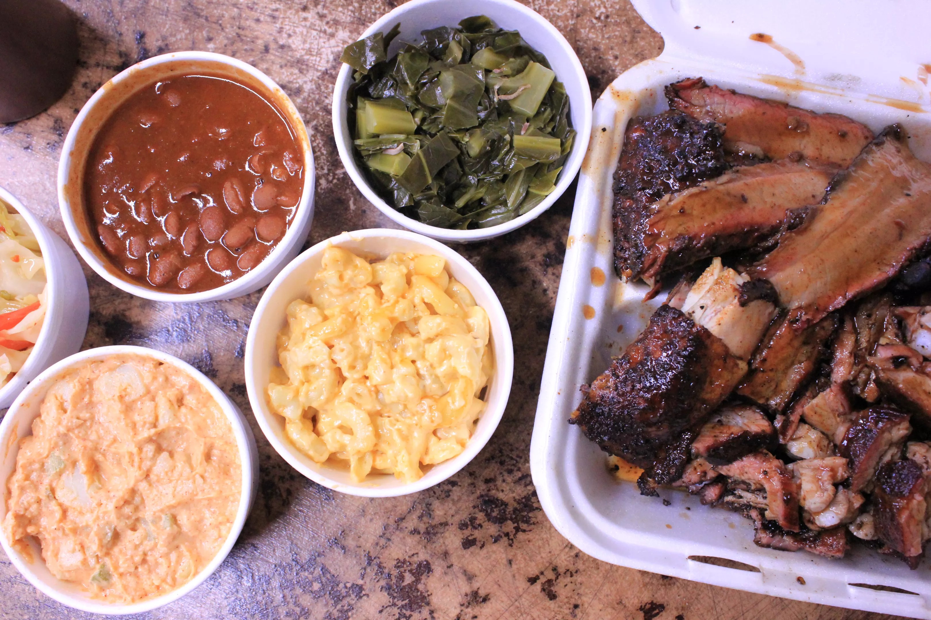 A mixed meat platter and armada of sides from JL Smokehouse.