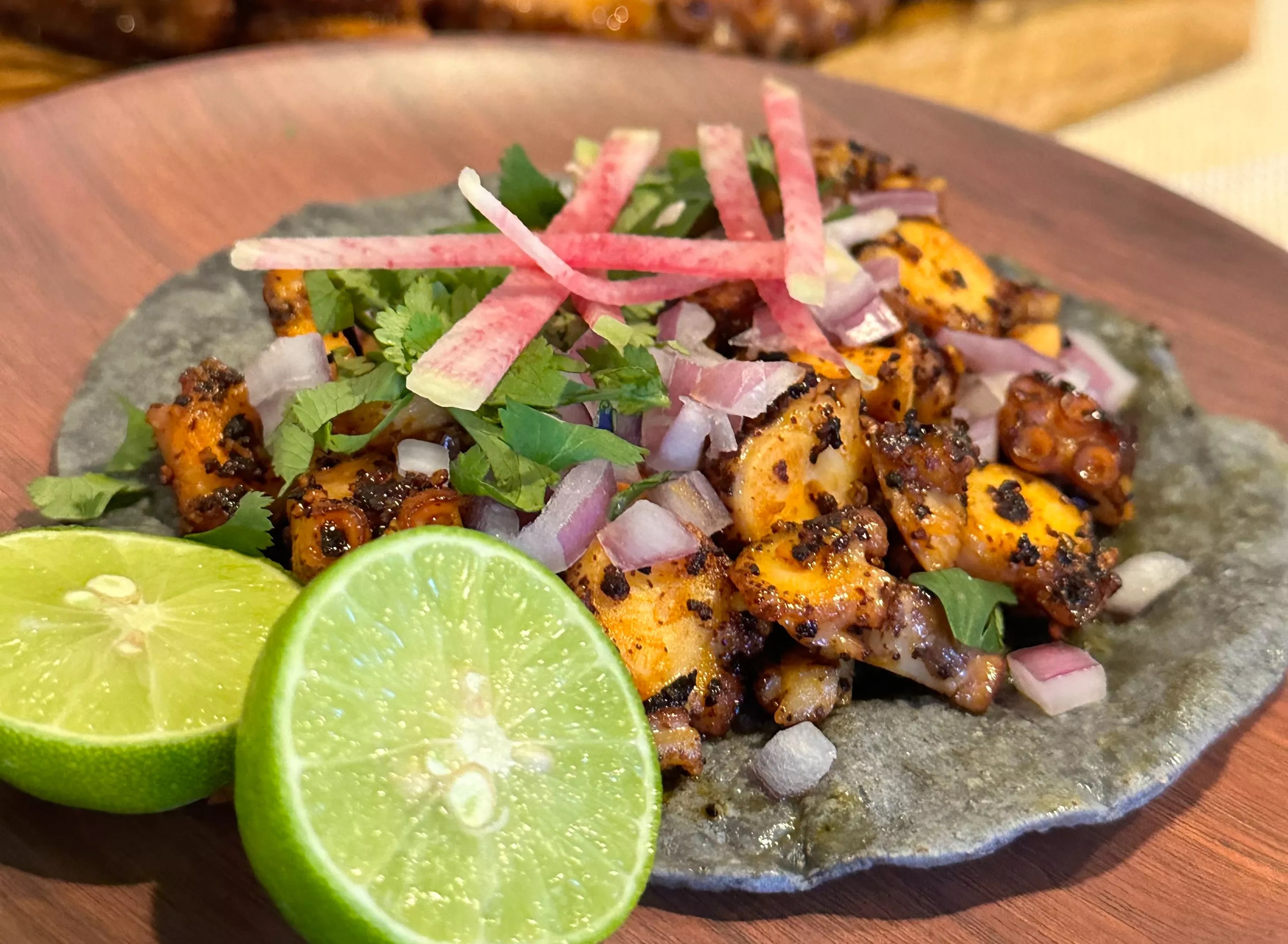 S.A.L.T. – an acronym for Sea and Land Tacos – offers traditional and unique tacos, including its octopus taco, served on a blue corn tortilla.