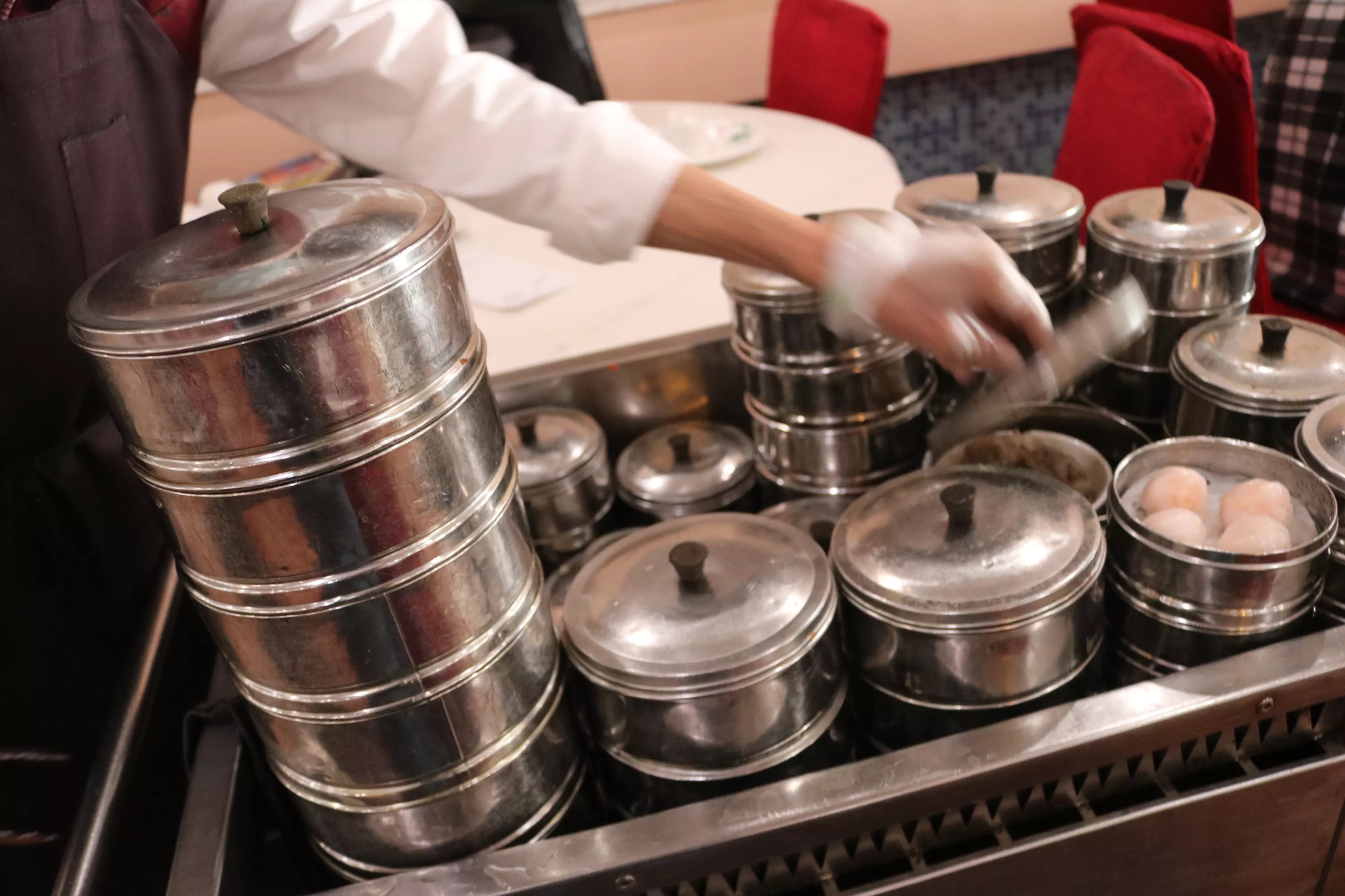 Servers lift the lids from small steamers to reveal the snacks inside.