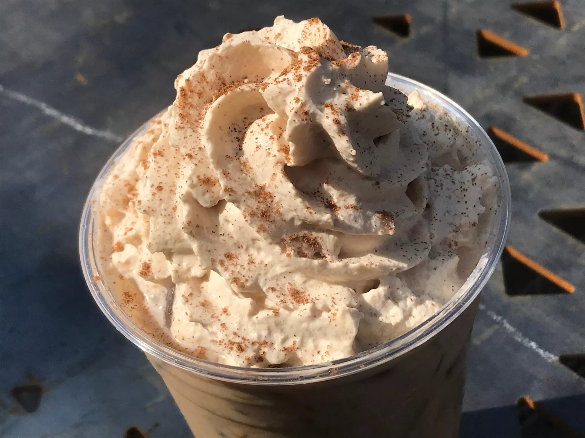 Starbucks serves pumpkin spice frappuccinos made with coffee, milk, ice, and fall spice flavors, then topped with whipped cream and pumpkin pie spice.