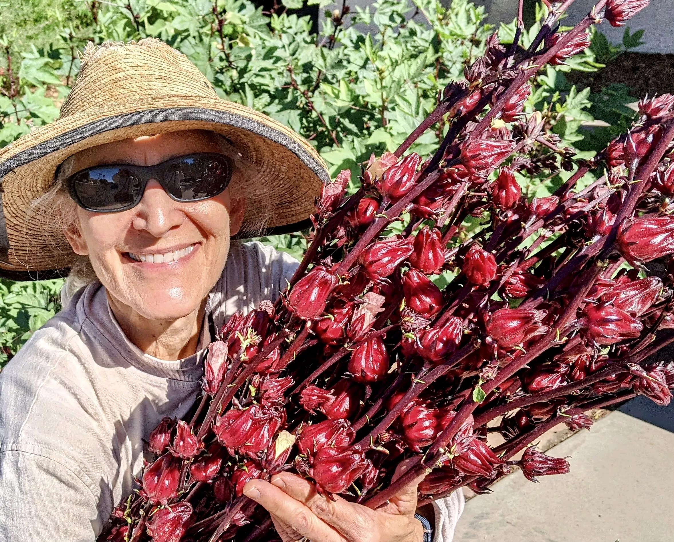 She leases farmland in Chandler from Greenhouse Gardens to grow the hibiscus. Hibiscus is a large plant and a row crop. In 2021, she had 180 to 200 linear feet of the hibiscus crop. She explains that it is a tropical plant and can grow in the low desert. “They grow six to seven feet tall. It is extremely heat-tolerant and needs deep water.”