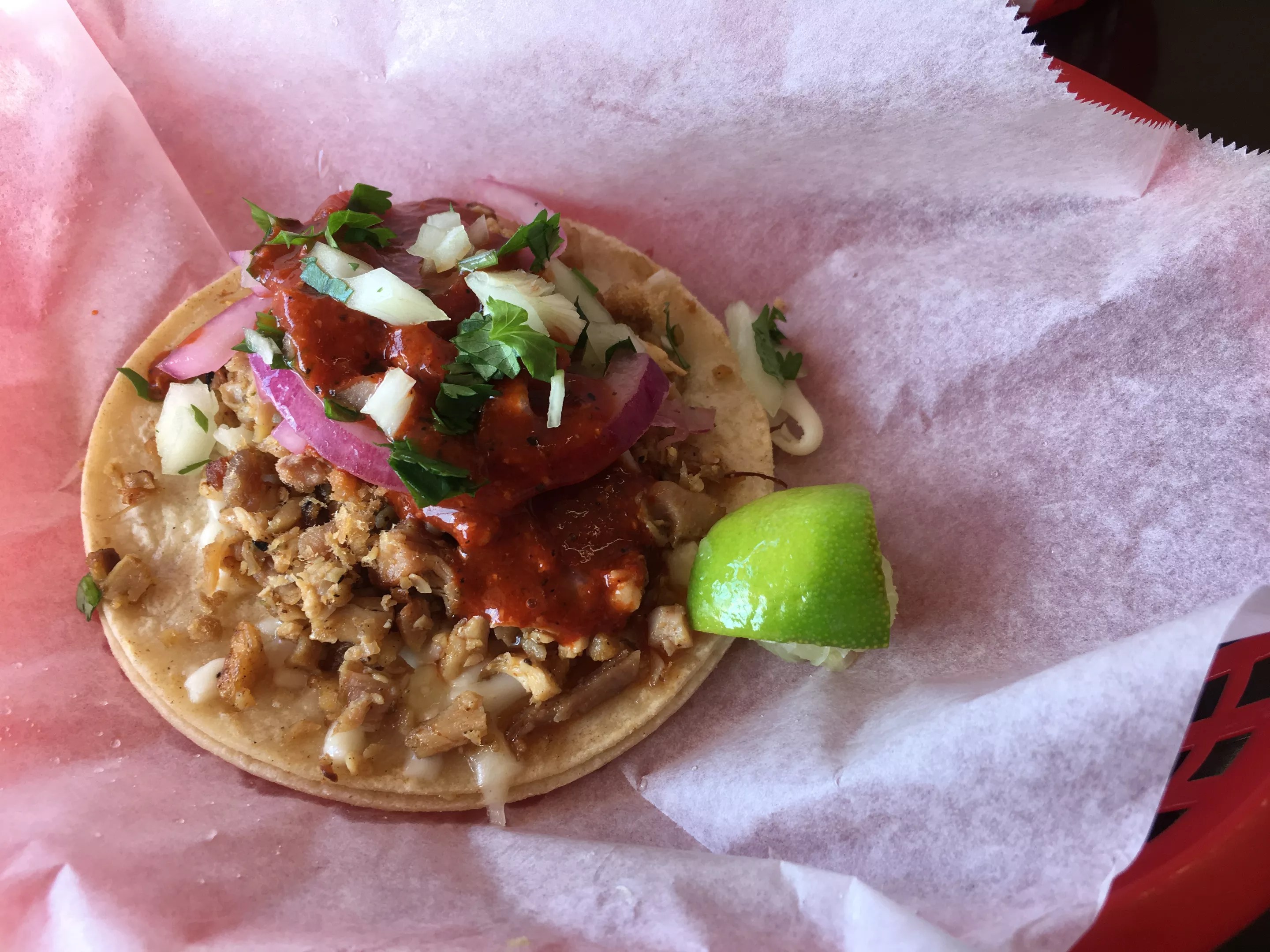 A chilled salsa bar awaits. Deep spoons protrude from tubs of green (hot and mild) and red (just hot). You can also top that chicken – the restaurant’s meat of choice, rare for a Mexican spot – with pickled red onions, white onions, scallions, shredded cabbage, cucumbers, or lime juice. I loaded up and sat down to eat. The chicken was nicely grilled, and juicy for meat so finely chopped. Red salsa made from a blend of peppers (habanero, jalapeno, serrano, and chile de arbol) brought brightness and blunt heat. As soon as I finished that taco, the other three landed on my table. All right.