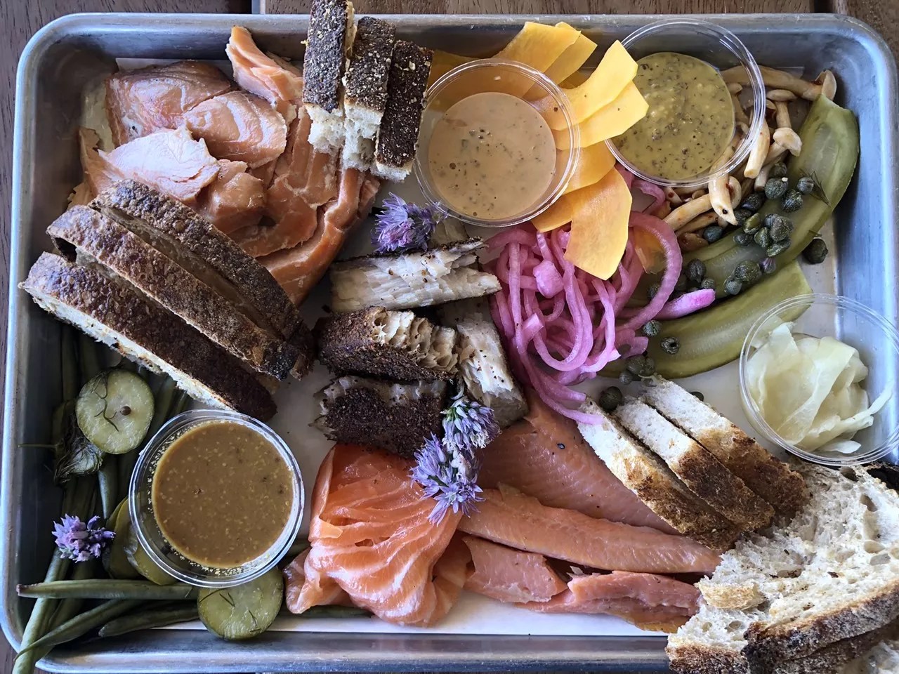 On the tray you will find, in pink folds and green curves and yellow pools, in some variation based on what’s in, Noble Bread, pickled ginger, pickled enoki mushrooms, capers (not pickled in house), Steve’s Wonder Mustard, house-made thousand island dressing (great with pastrami-style smoked fish), miso dressing with a spice that might surge up your nostrils, pickled onion, pickle butternut squash, pickled string beans, and five or so kinds of smoked fish. What kinds? It changes.