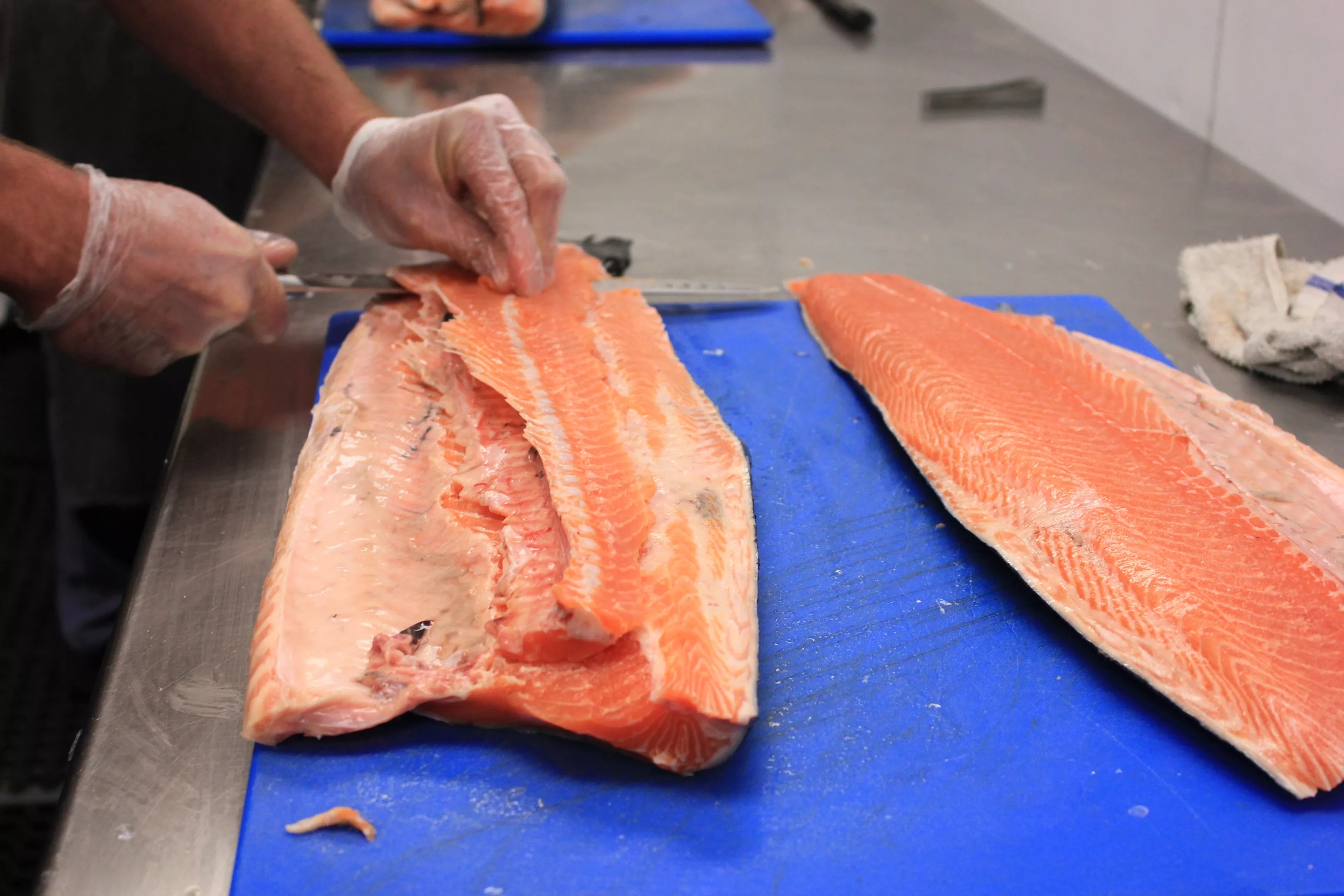 Hogan Jamison cleaning a whole Faroe Island salmon.