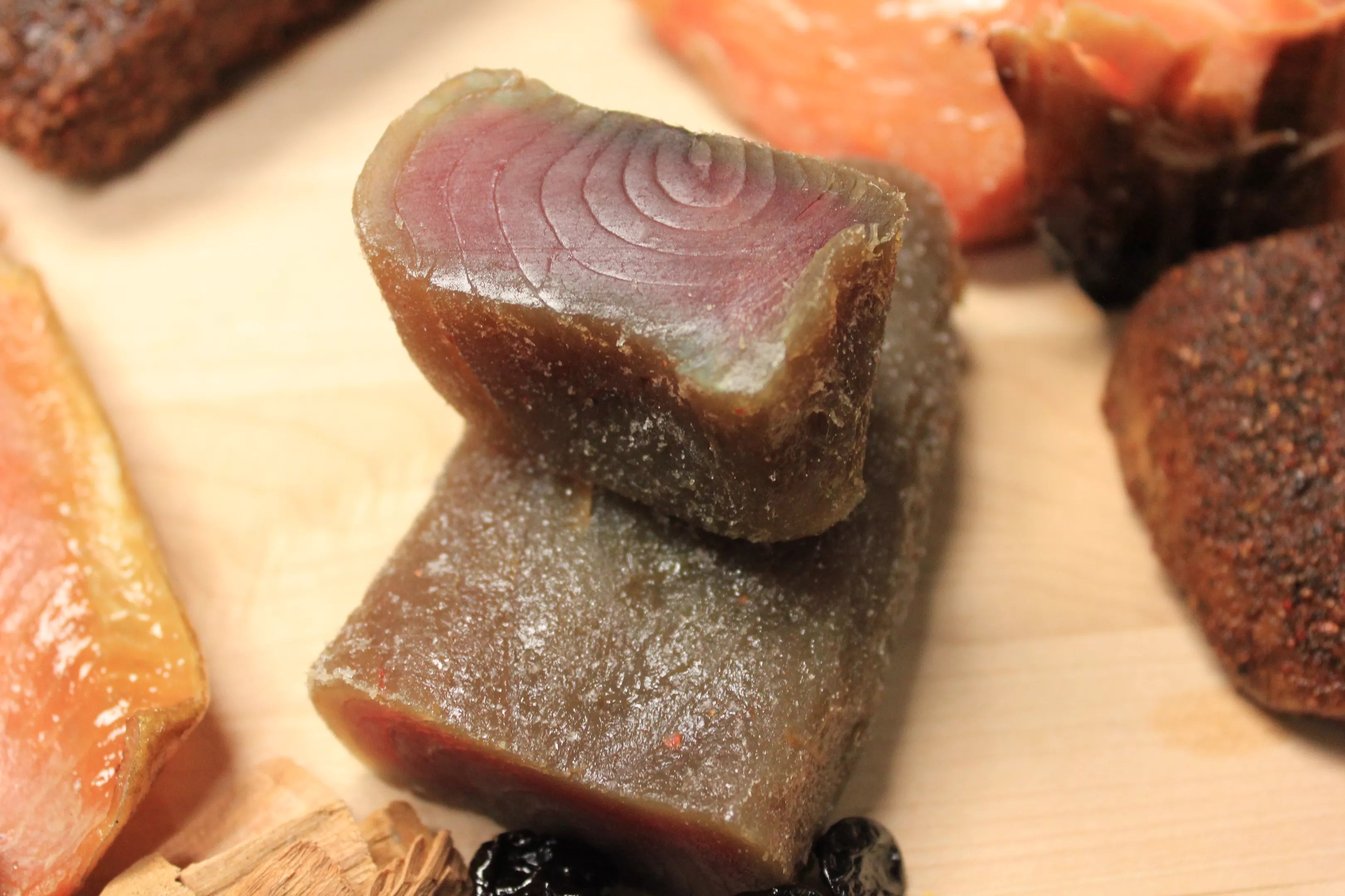 Mojama is a cured yellowfin tuna, a Spanish delicacy. To make mojama, Zamora cures tuna for three months. He then air-dries the fish for three to four weeks depending on the tuna’s size. The purple-black lump that results looks like a living rock from Neptune, but, grated over food as you would grate Parmesan (or bottarga), mercurial flavors can be added.