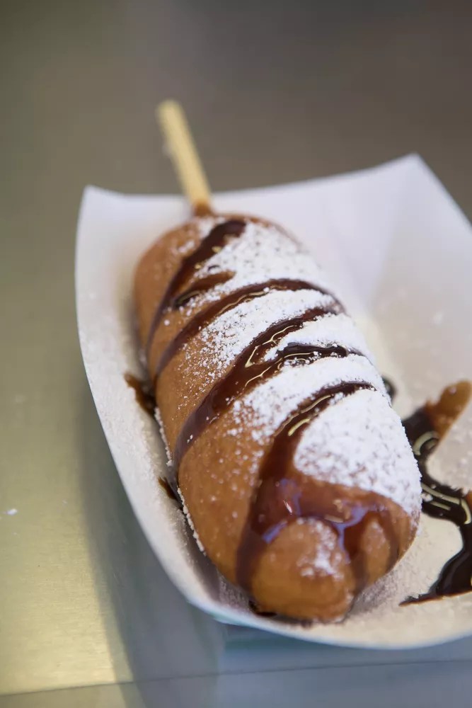 Yep, a chocolate tamale. And the thing comes on a stick. News of the creation got me jazzed up. Why? The fair was opening in a few hours, and I was on my way to do some eating. Here’s what I ate earlier this afternoon in the oily hours just after the gates of the fair opened. It runs through October 29.