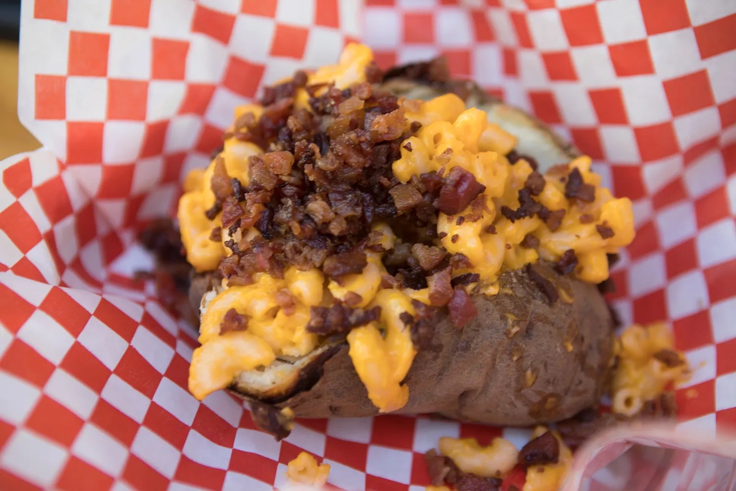 Baked Potato Loaded with Bacon Mac and Cheese The high today was projected to be 97 degrees. It was way too hot to be walking around eating a baked potato with mac and cheese. Maybe this would have hit the spot on a later October day. Not today. The potato, though baked to cloudy softness, felt diluted down to 50% of what it should have been. The mac and cheese had a sad, anemic flavor, and not even bacon could come to the rescue.