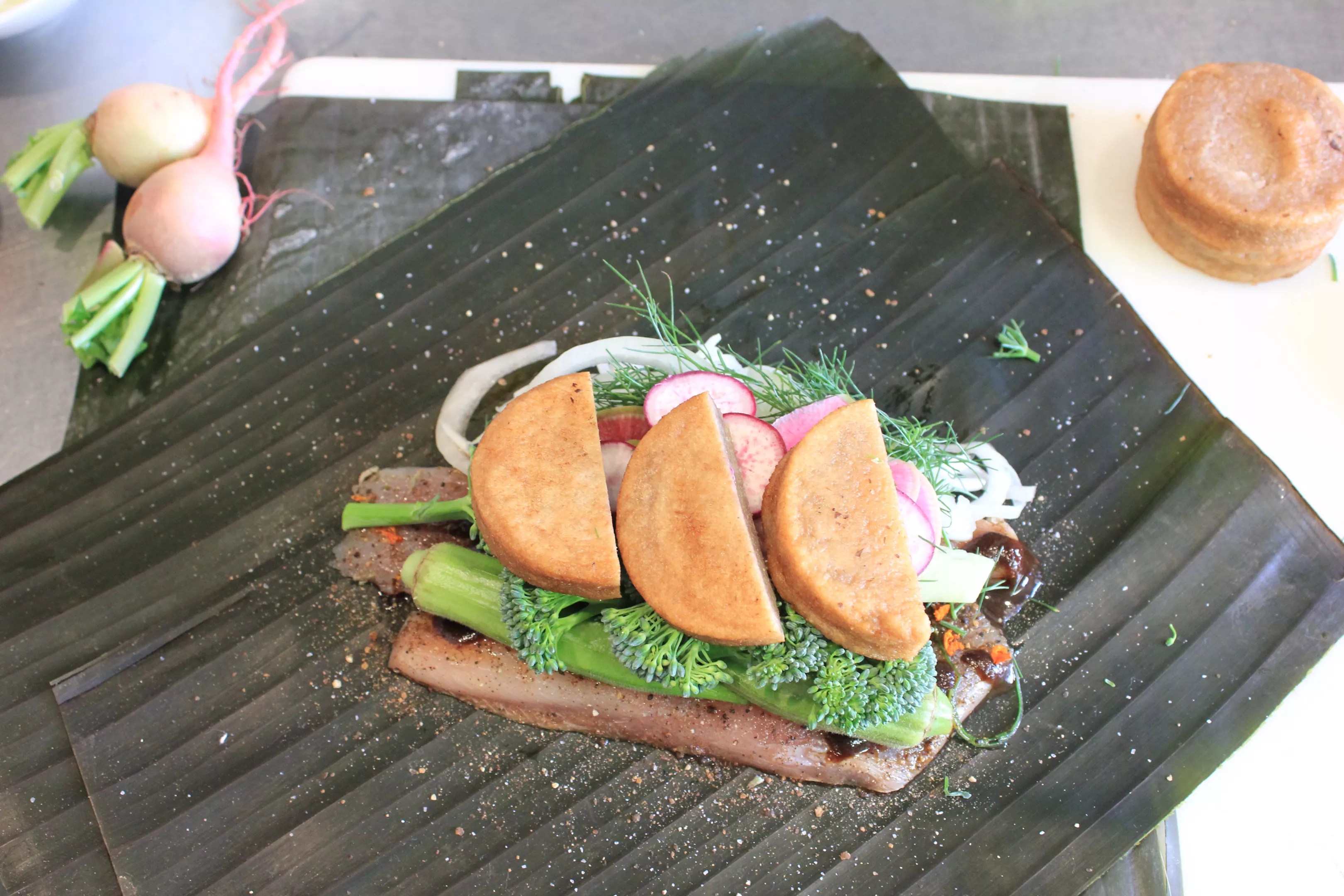 “It’s prepared in a very traditional way, which is wrapping it in a banana leaf,” Leoni says. “You pull your fish offshore and you have nothing but sand and maybe a fire. So you pick a leaf off a tree and you wrap it up.”