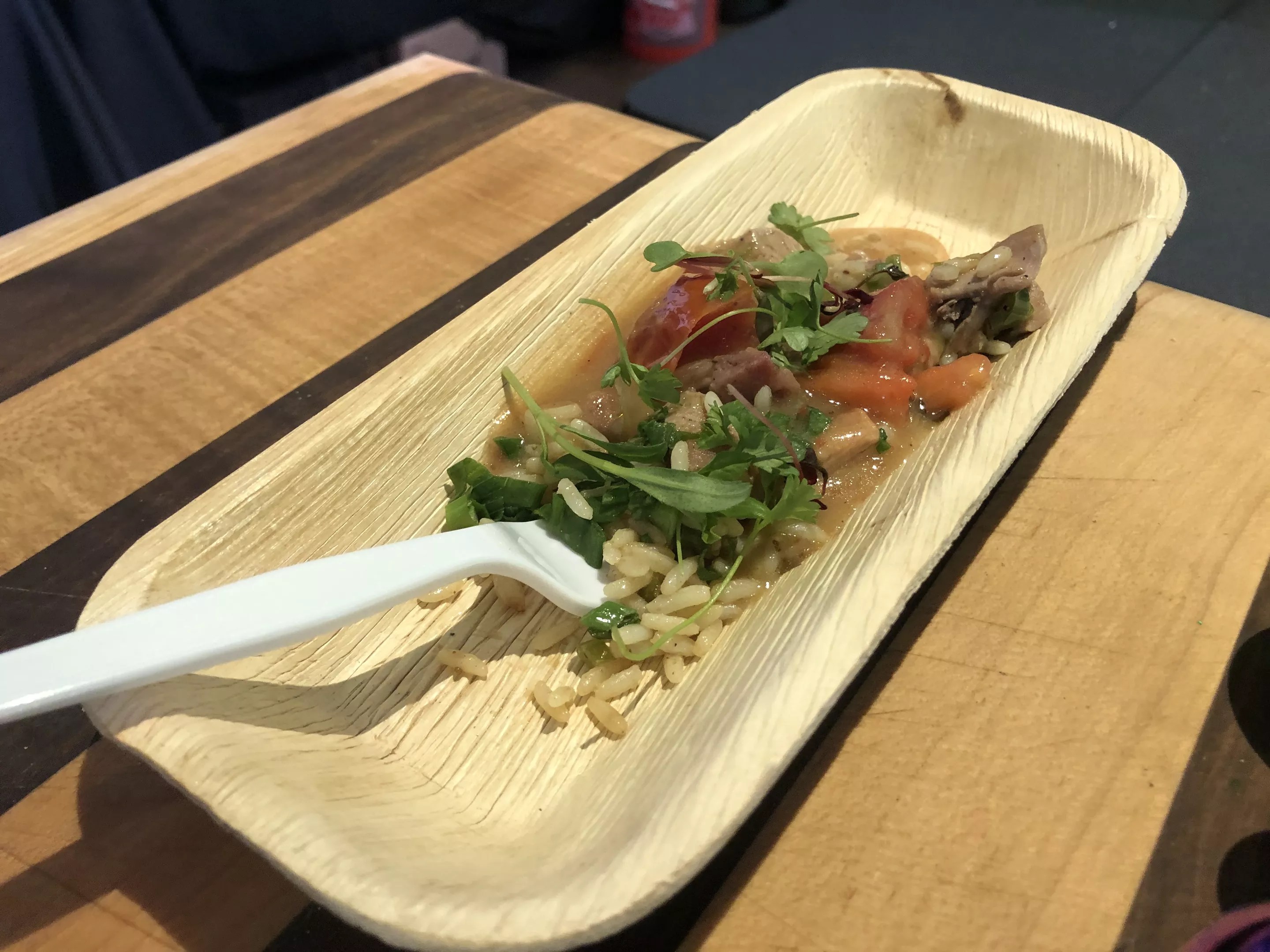 Sometimes, a classic is needed. In this case, The Parlor took the classic plate of chicken in lemon juice, capers, and white wine and jumbled its equation by introducing a giant pillow of herb-flecked ravioli. This soft ravioli’s velvety sauce called to mind the floods of Saturday. The single raviolo on each lipped plate was just swimming. After one bite, the creamy sauce rushed in through the tear to soak the pasta’s filling. I bet some people skipped The Parlor’s stand, given the simplicity of its three-ingredient sign, “Chicken Piccata Ravioli,” relative to other stands’ ornate descriptions. Big mistake. Closeup of a damn good jambalaya from Justin Beckett. Chris Malloy