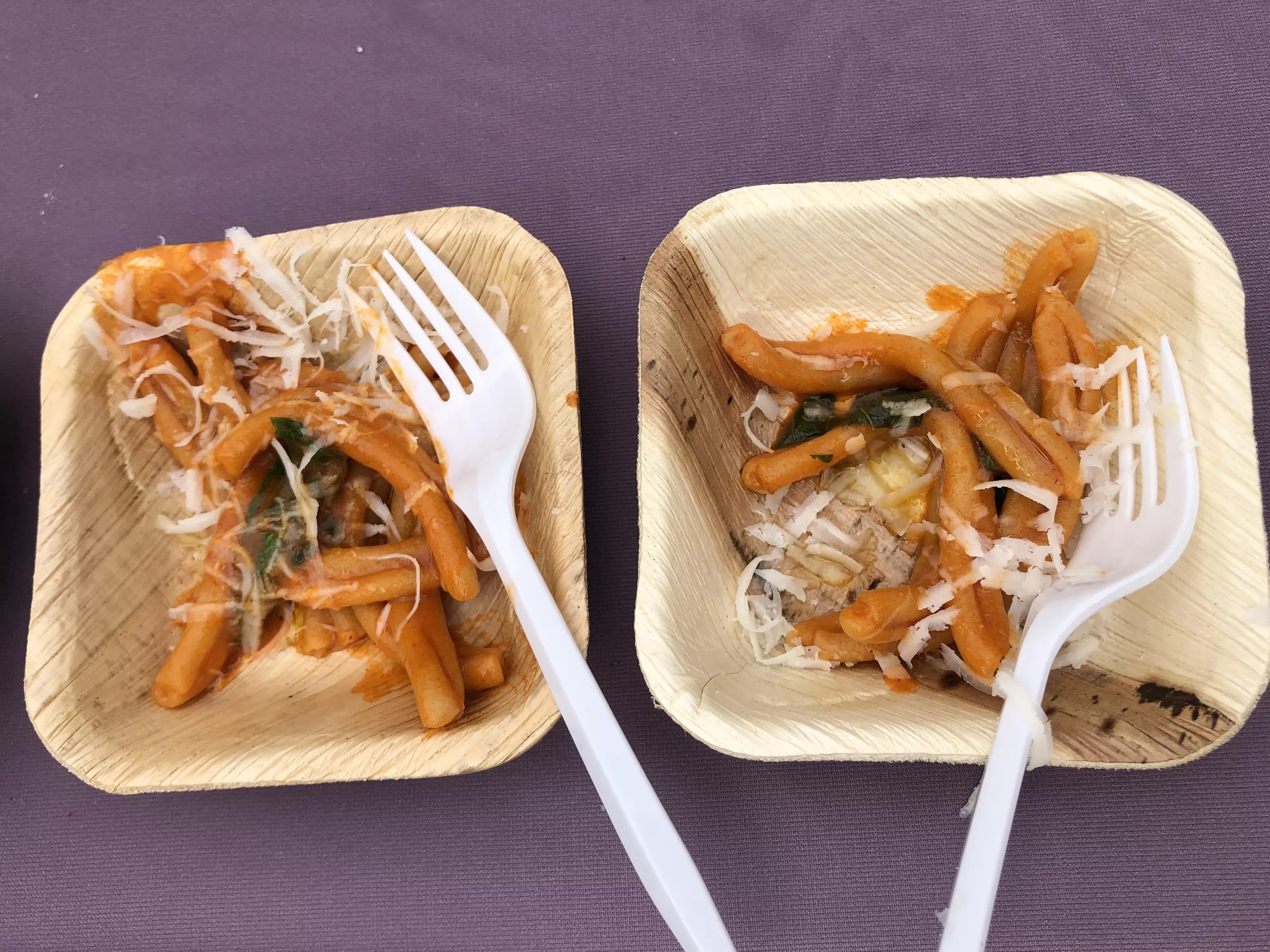 In a weekend of more than 70 bites of food, this was the only one I returned to for seconds. Donald Hawk of The Gladly and Brent Kille of Sonoran Pasta Co. in a way reprised KoSo, their old pop-up, with an East-meets-South pasta. This dish rolled the dice and messed with a classic. That classic is amatriciana, a central Italian sauce of tomato, cured pork (guanciale or pancetta), onions, and long-strand noodles.