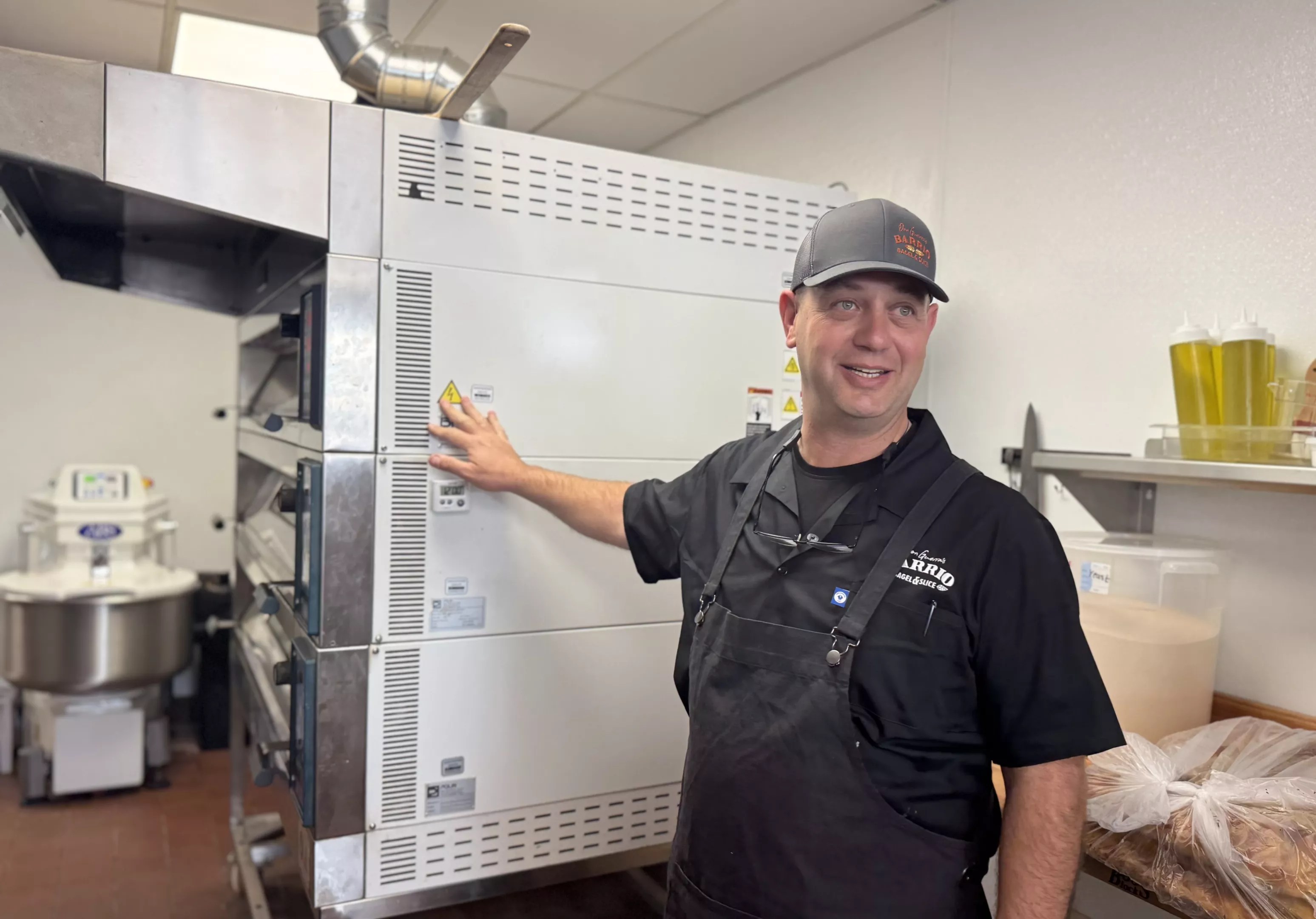 Oren Molovinsky, a partner of Don Guerra’s Barrio Bagel & Slice, points to the restaurant’s oven, the same one Guerra used during his early days baking out of his Tucson garage.