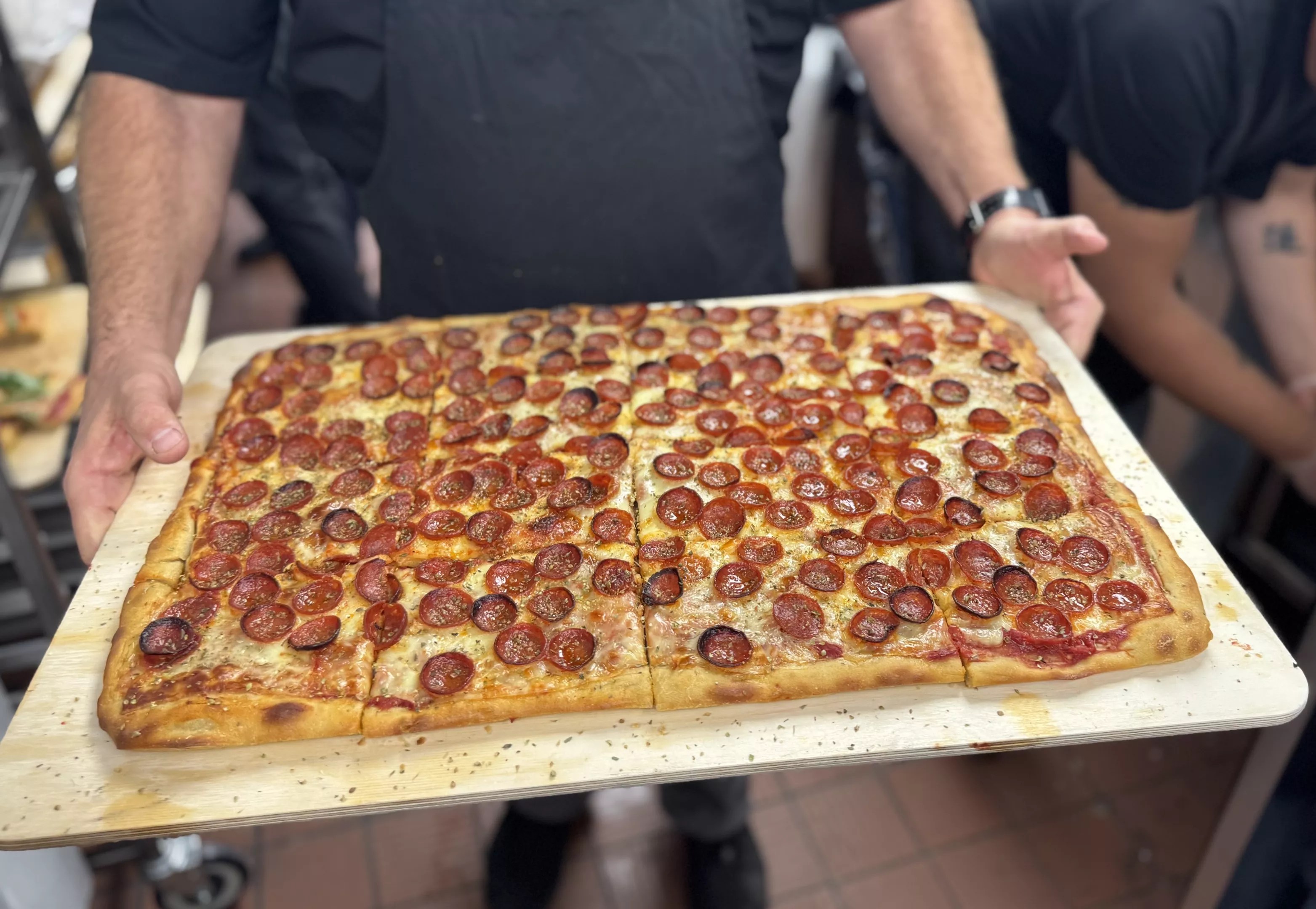 Barrio Bagel & Slice pizzas are made on sourdough focaccia and topped with Bianco DiNapoli tomatoes and mozzarella.