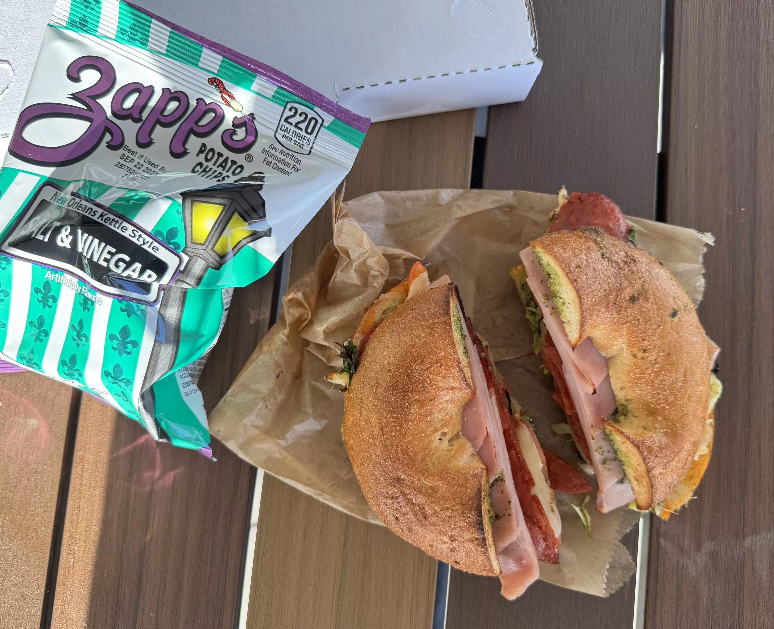 An Italian on a Sonoran bagel and a side of Zapp’s Potato Chips from Barrio Bagel & Slice.