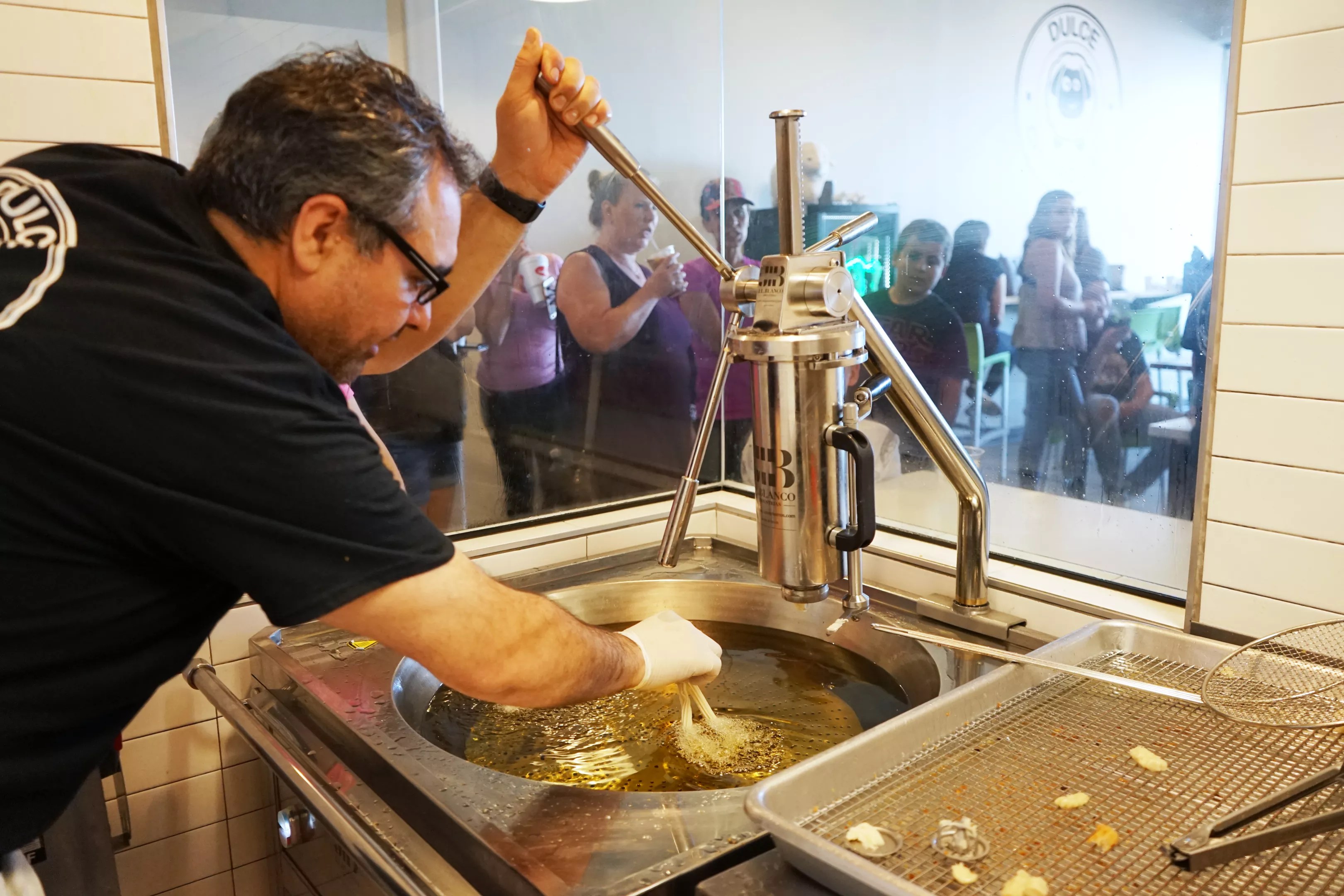 Dulce owner Jared Naumann makes a fresh batch of Spaniard churros in the kitchen as visitors watch.