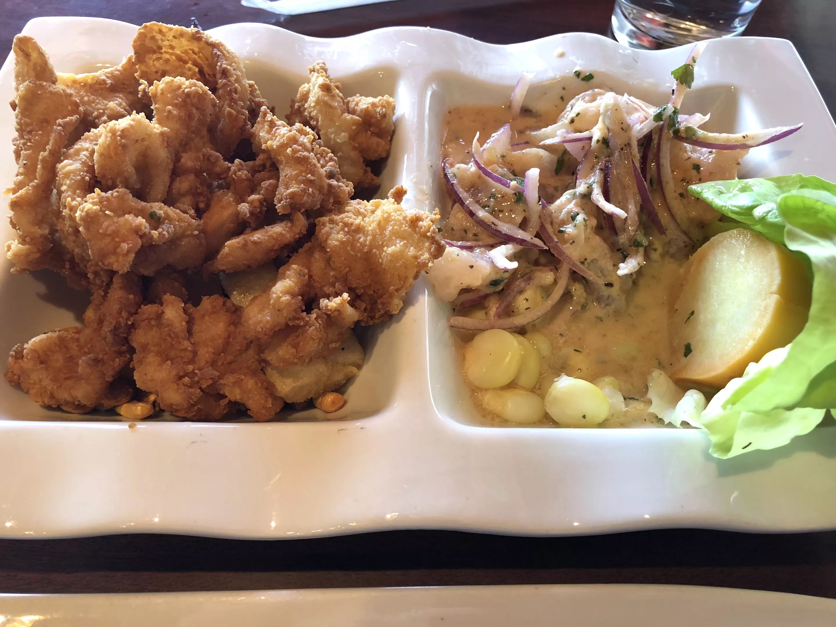 I sat eating beef heart, ceviche, and jalea (fried fish) at a table looking out a window. This was at El Chullo, the underrated Peruvian Restaurant on Seventh Street in central Phoenix. The beef heart is a $10 starter that could be a meal. An order comes with two skewers, five heart medallions per skewer, the long metal spikes projecting over their plate.