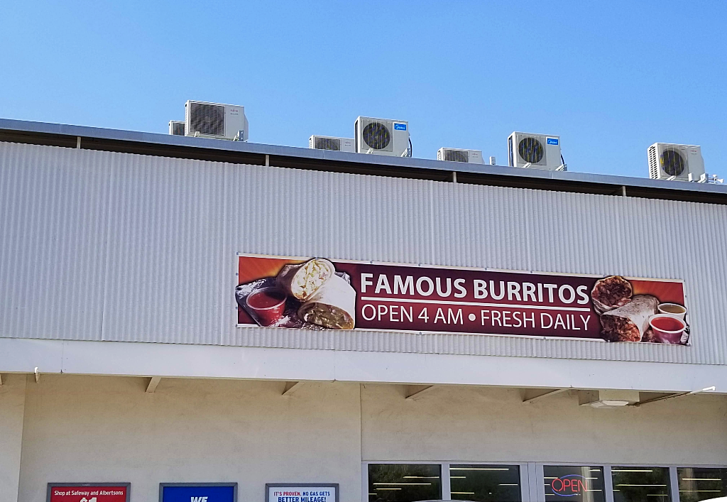 A large banner over the entrance reads: “Famous Burritos – Open 4 a.m. – Fresh Daily.” Earlier this year, a newer banner was affixed to the side of the building, this one advertising “FAMOUS BURRITOS” in all-caps.