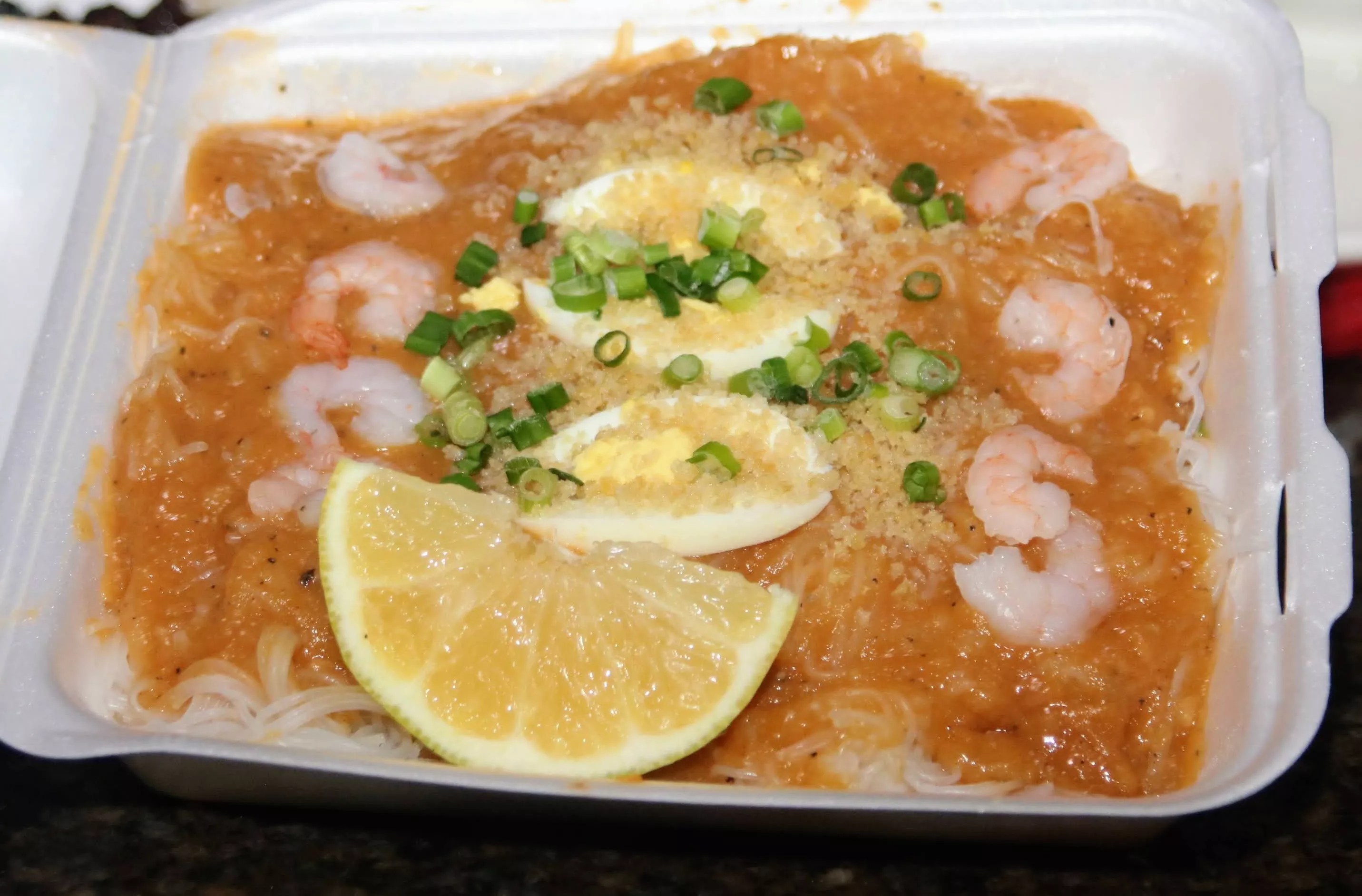 Wholly Grill’s pancit, a noodle dish with shrimp and hard-boiled eggs, is a treat during the holidays.