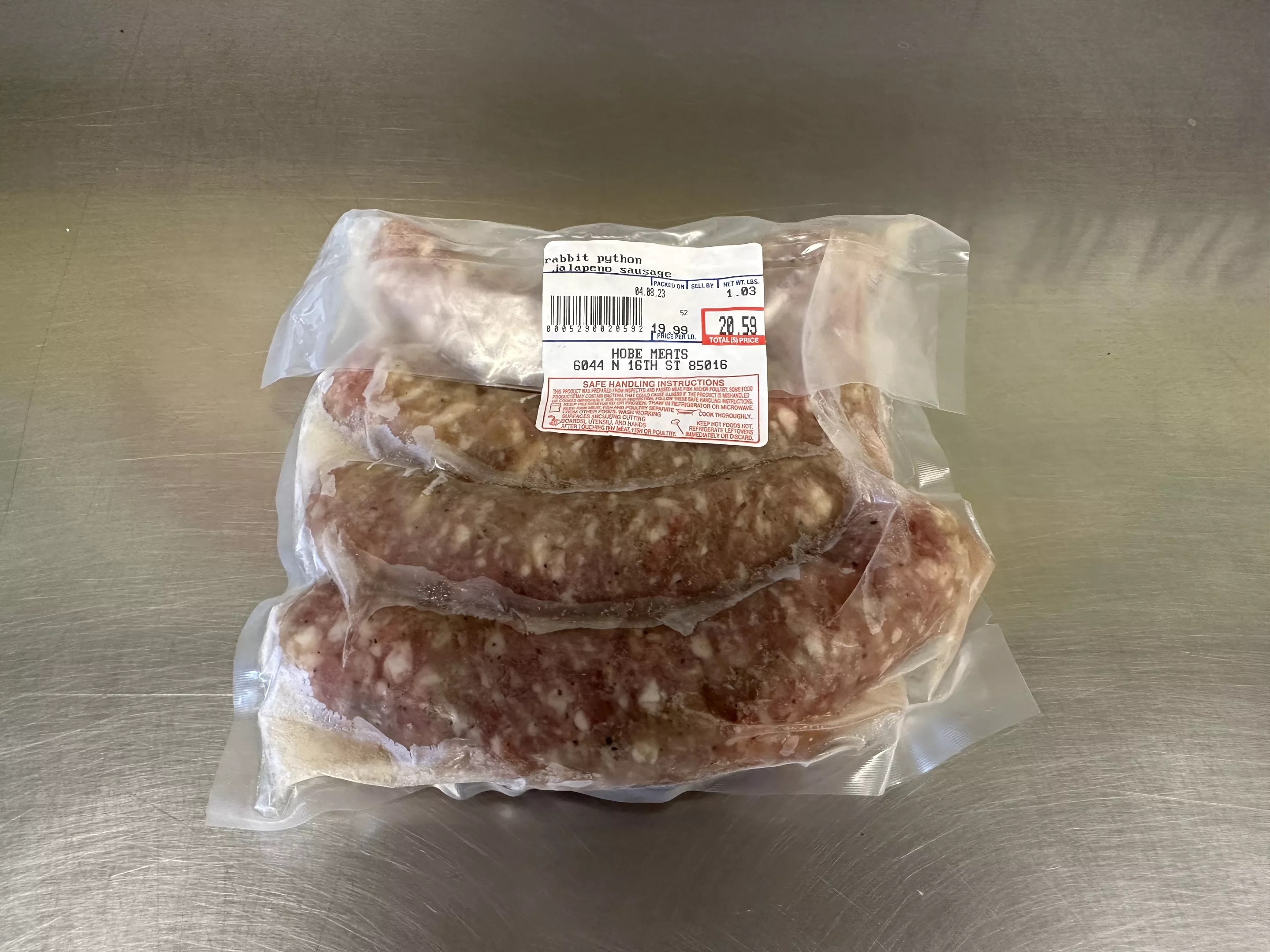 Jalapeño Rabbit Python Sausage is sold at Valley butchers Hobe Meats and Off The Hook Meat Shop.