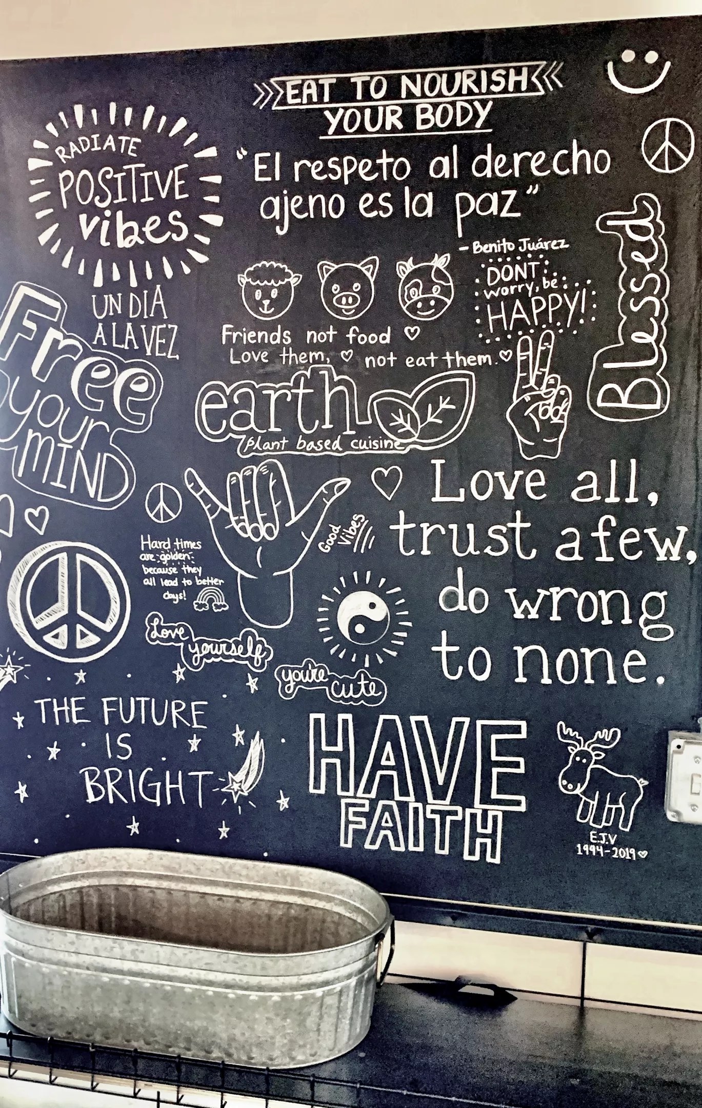 Inside is simple but airy. Rectangular tables made of natural wood, surrounded by metal chairs, stand neatly in rows. Little succulent planters adorn the tables. This wood-and-metal theme recurs throughout the space. But two fixtures draw the eyes when you first enter the restaurant. One is a sliding panel featuring a brightly colored painting of the earth surrounded by plants with smiling animals in its center. The second is a blackboard of inspirational quotes ranging from “EAT TO NOURISH YOUR BODY,” and “El respeto al derecho ajeno es a paz,” to “Love yourself. You are cute.”