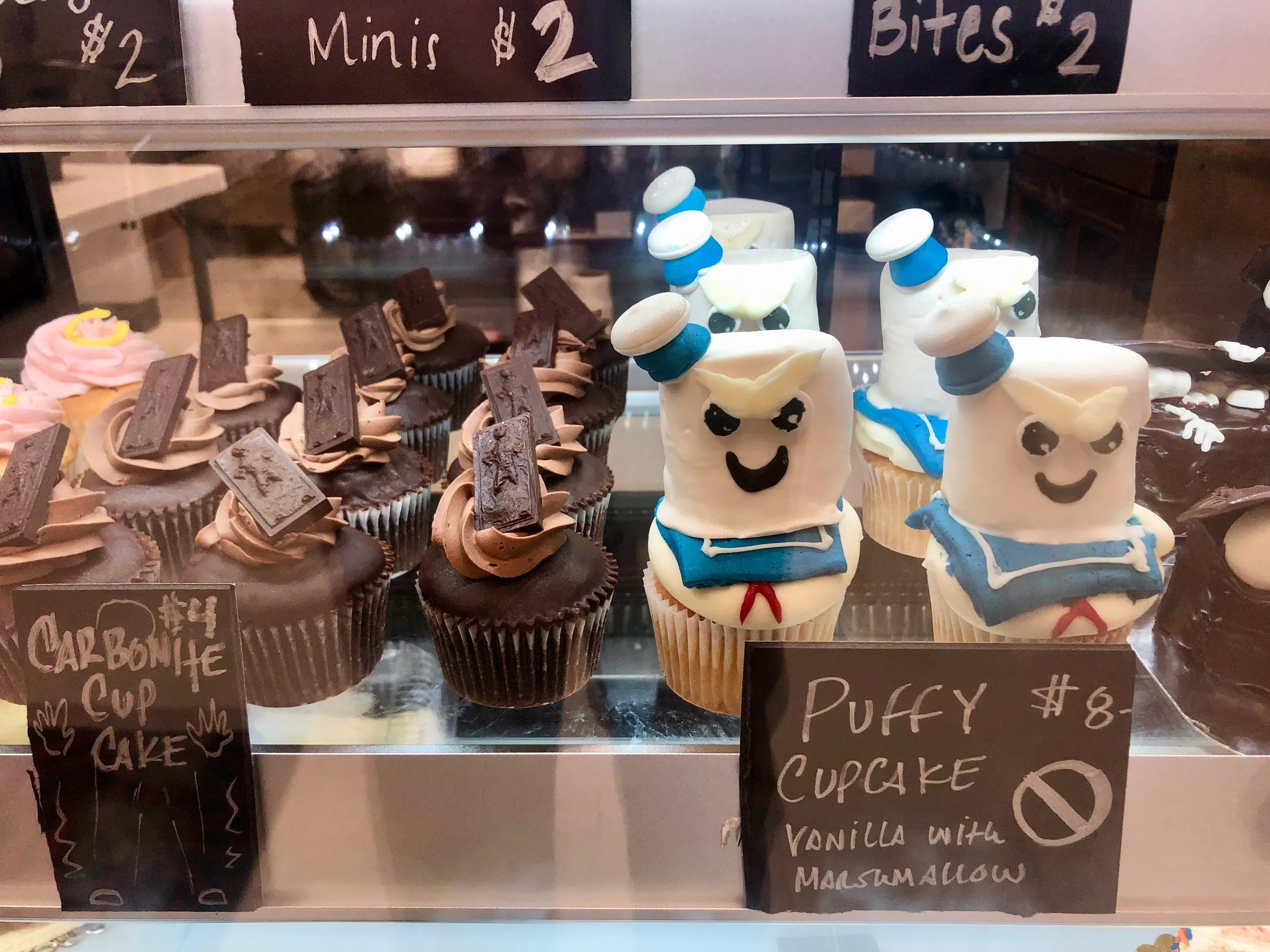 Star Wars: Return of the Jedi and Ghostbusters-themed cupcakes in the display case.