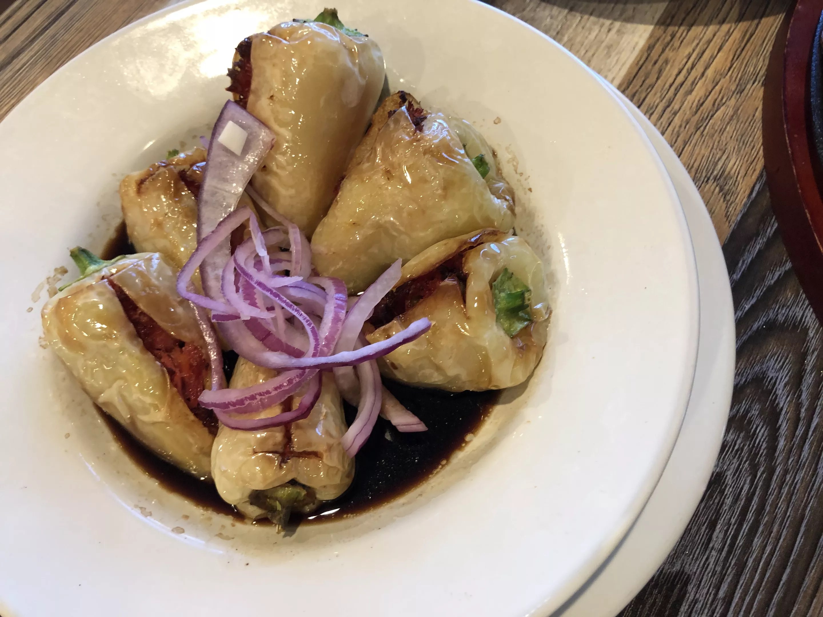 Marlin-stuffed peppers in a dark puddle of soy sauce.