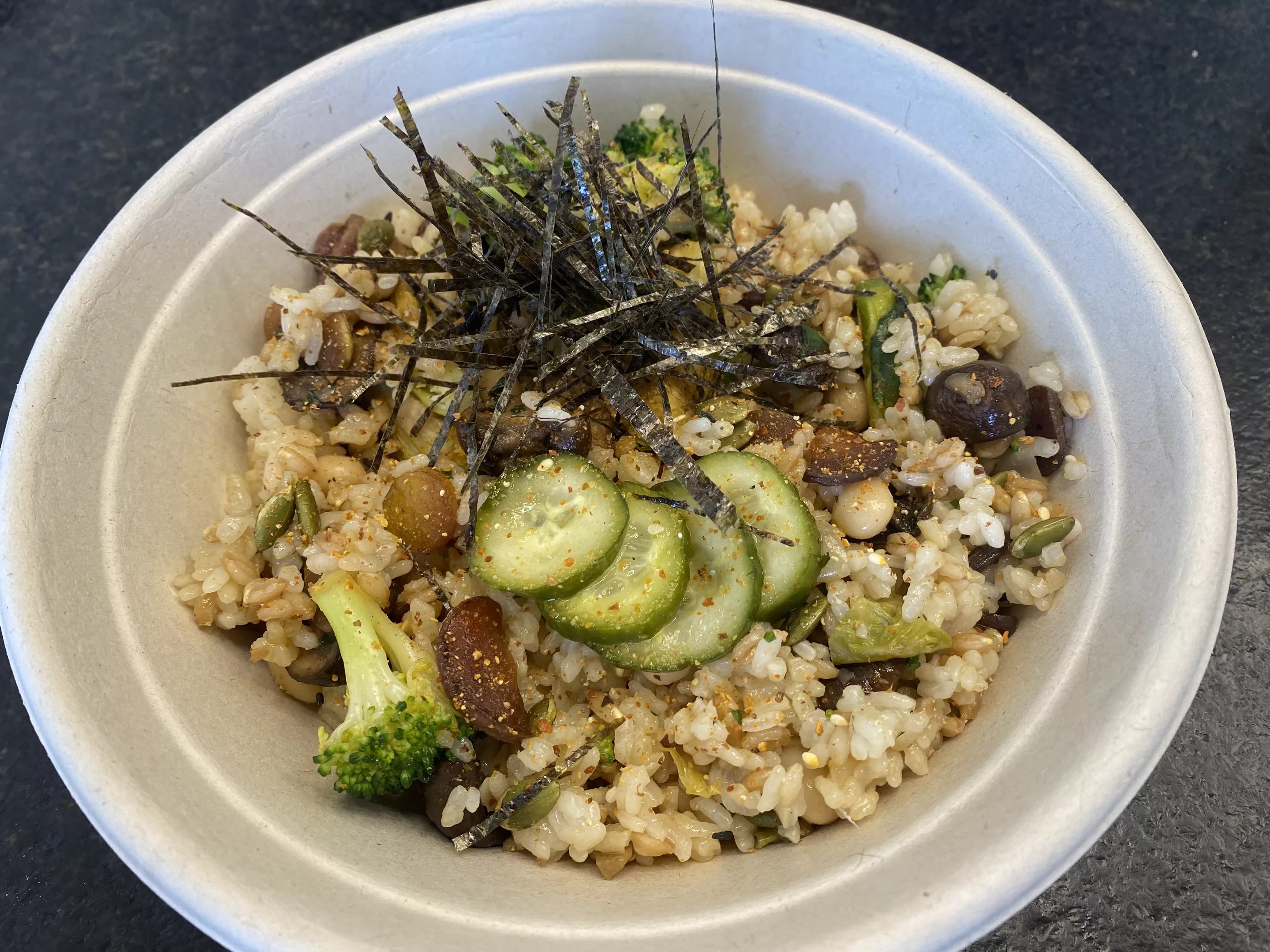 Unfortunately, the Rice Bowl ($13) wasn’t as flavorful as the Mediterranean dishes, despite the cornucopia of goodies involved. It included Koshihikari rice (a grain developed in Japan after World War II), farro, roasted vegetables, mushrooms, Controne beans, pumpkin seeds, ginger pickled cucumber, nori, and togarashi, but it came off as one-dimensional.