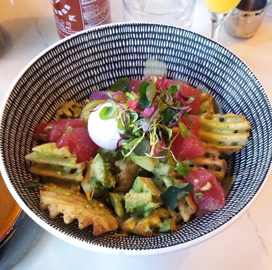 There’s a whole category of breakfast poutine with everything from cheese curds to black truffles, scallops to duck-fried herb potatoes. The tuna crudo immediately caught our eyes: waffle fries topped with ahi tuna, poached eggs, Hass avocado, sesame, white soy sauce, and cilantro crema. Ten out of 10: would have again.