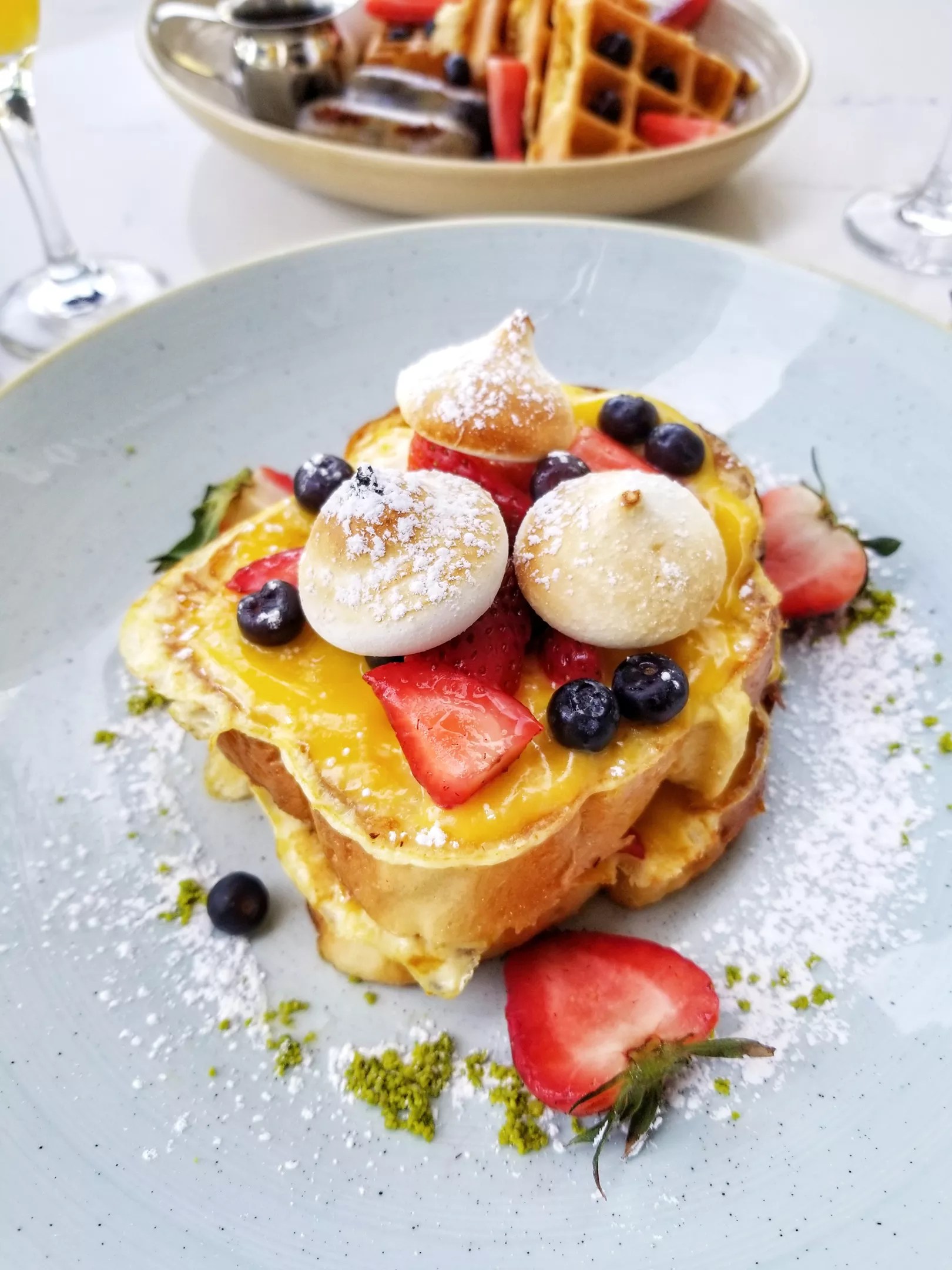 The lobster and shrimp crepe also beckoned, then arrived in all its golden glory: butter poached lobster and shrimp scrambled with green onions, brown butter hollandaise, and truffle pearls. We chose not to add organic sturgeon caviar, but later regretted the hasty decision. The crepe is unmissable for seafood lovers, a rich way to start the morning.