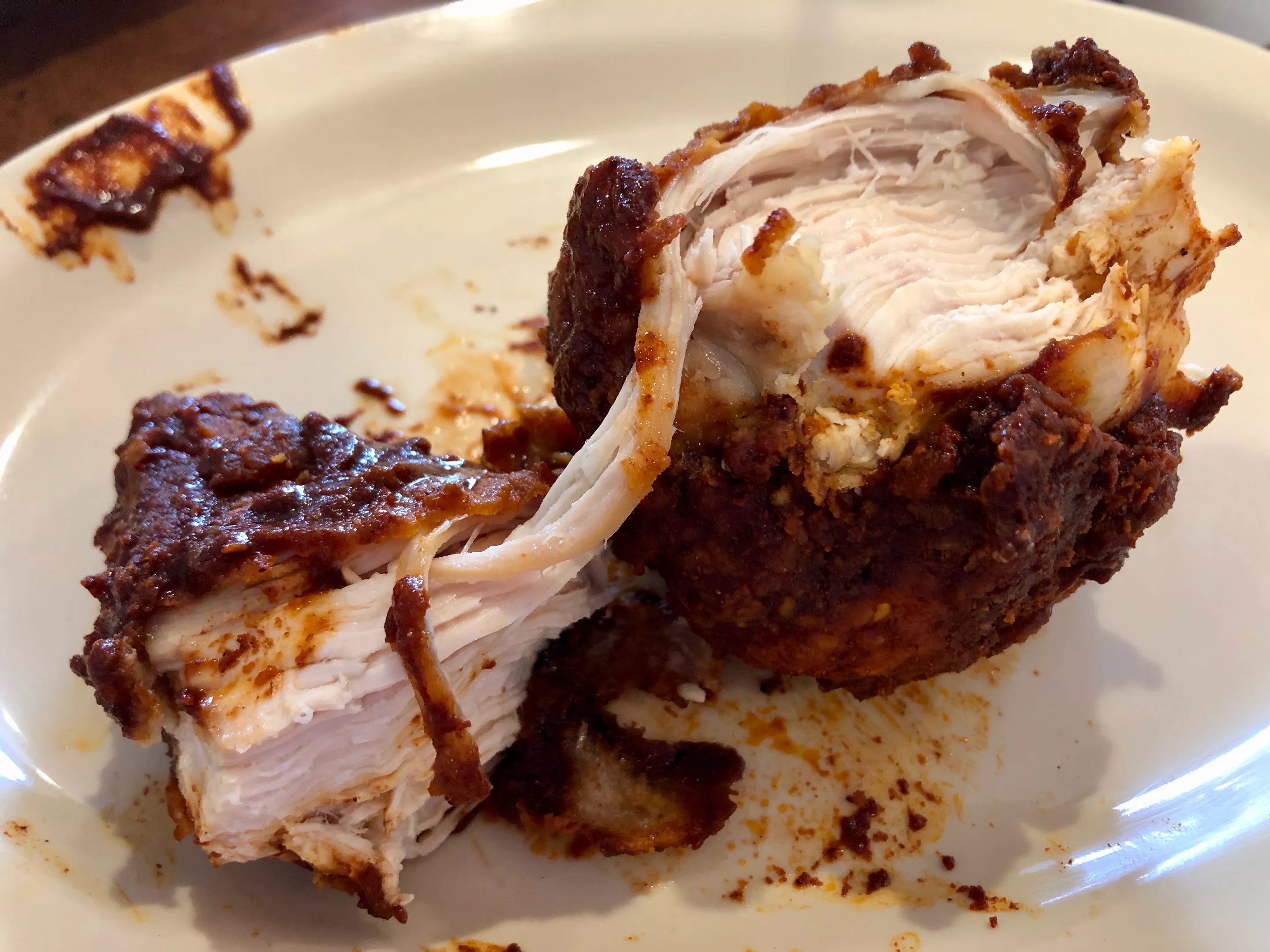 The first couple bites require some sharp inhaling – that weird reverse hissing we make when something is burning, temperature or otherwise. But about bite four, after you’ve been tearing and pulling the chicken apart, knowing you wear that sauce smell on your fingers for the rest of the day, you start to feel it.