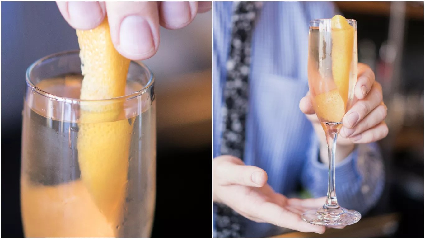 The Afternoon Delight cocktail features a couple of ounces of sparkling wine topping off splashes of green Chartreuse, grapefruit liqueur, and Lillet Rose. The drink is inspired by brunch-time and day drinking in France.