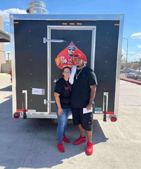 Abion Acoy and his fiancée Jen pose in front of the Ace of Wingz food truck.
