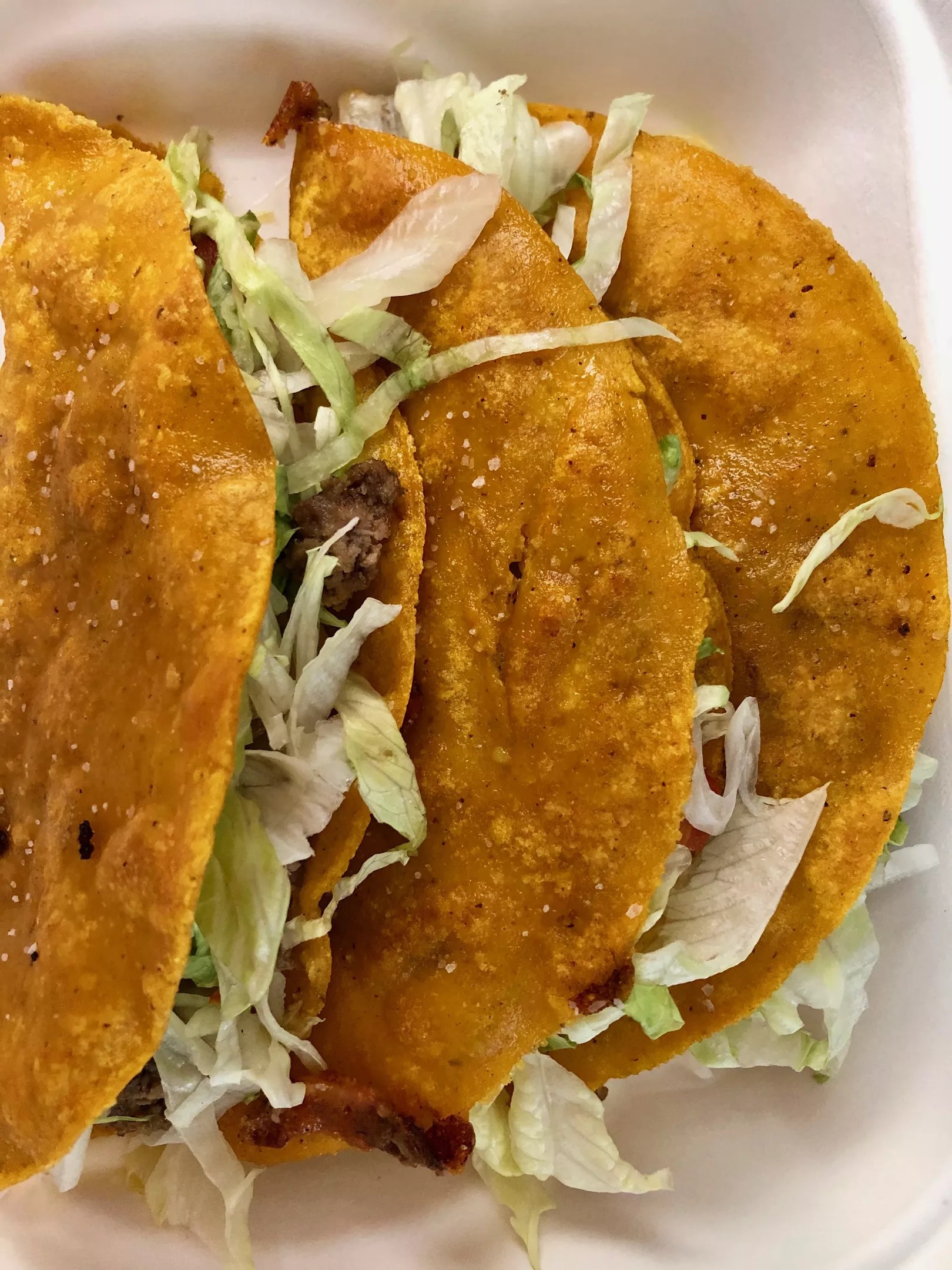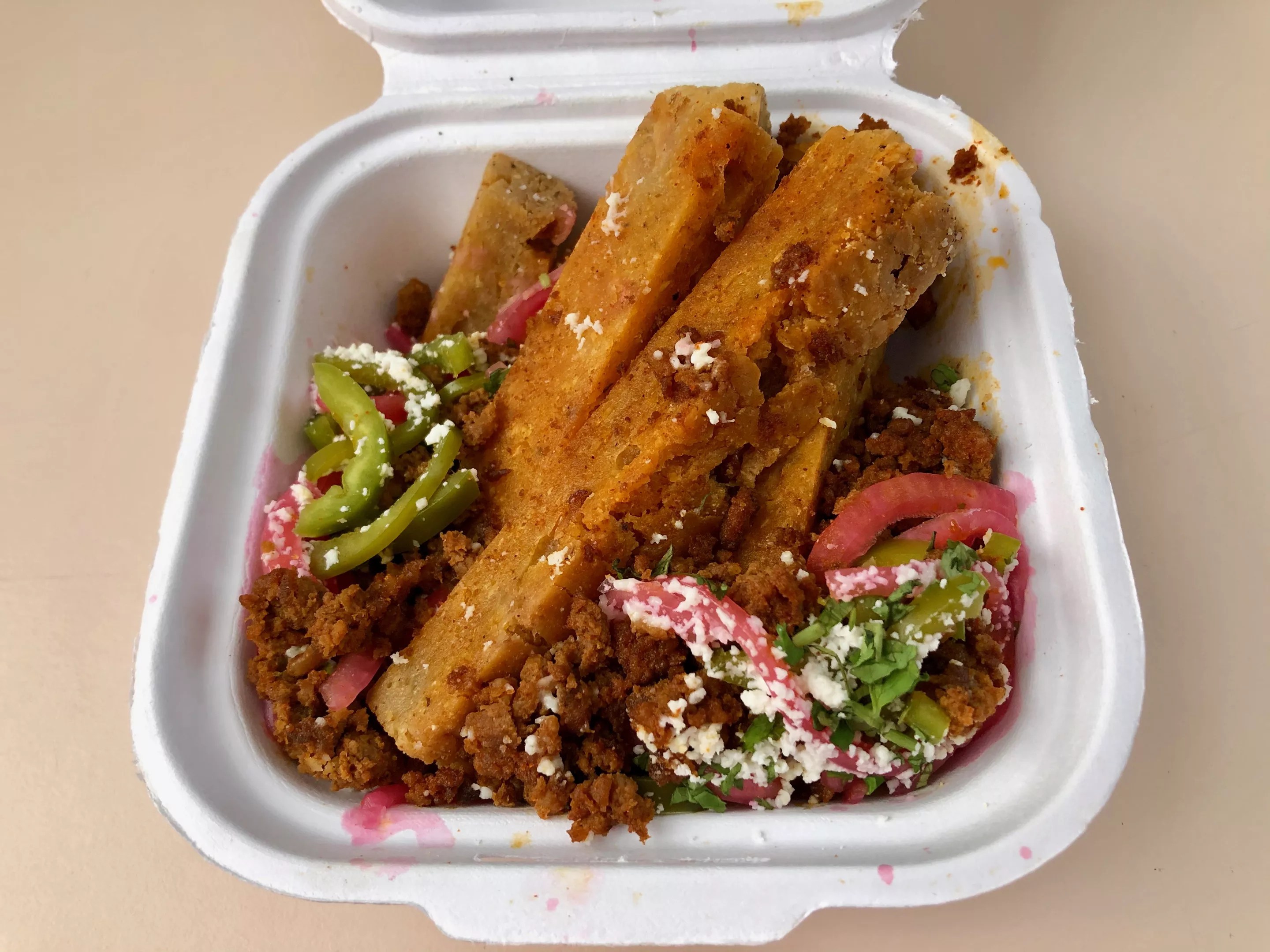 Grandma’s Tacos called out to me for some reason. They’re a good size and they give you three: well-flavored ground beef, lettuce, and tomato. The best part? The chunky salt on the outside of their crispy, oil-soaked shells, an excellent touch that I plan to adopt for my own tacos. Not as great: the chiltepin salsa could have used a lot more heat.