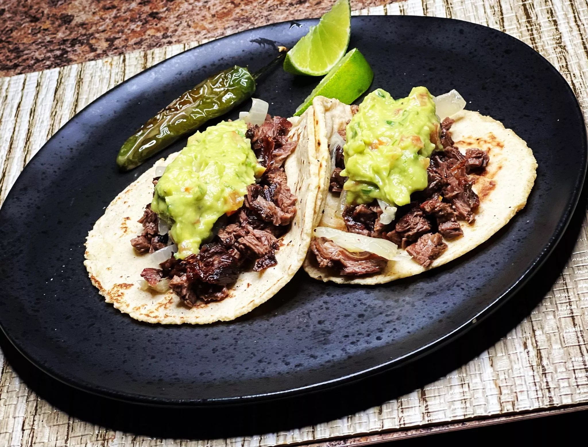 Carne asada (pictured) and pollo asado tacos come with guacamole, sauteed onions, cilantro, and lime wedges.