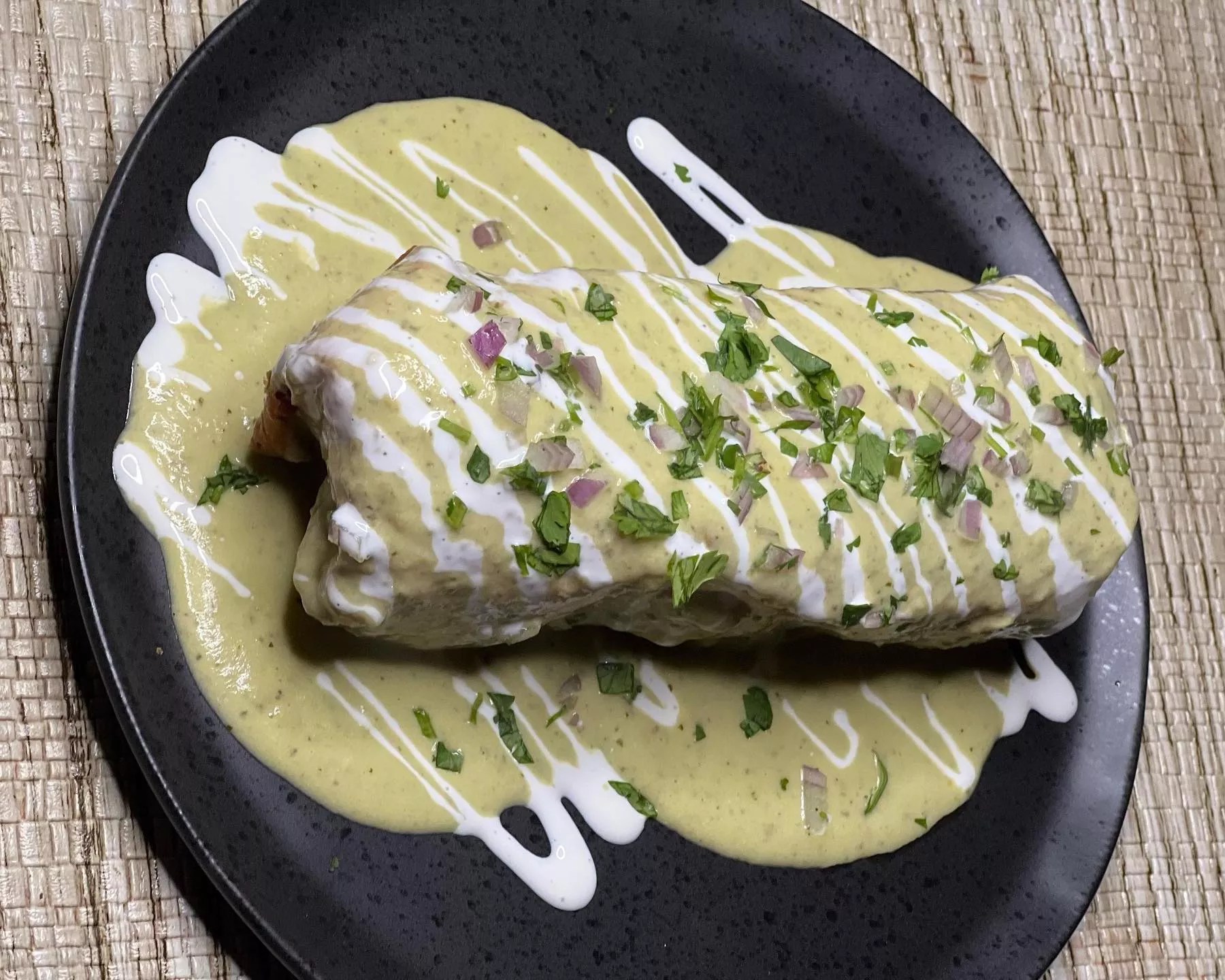 The chimichanga is smothered in a creamy salsa verde.