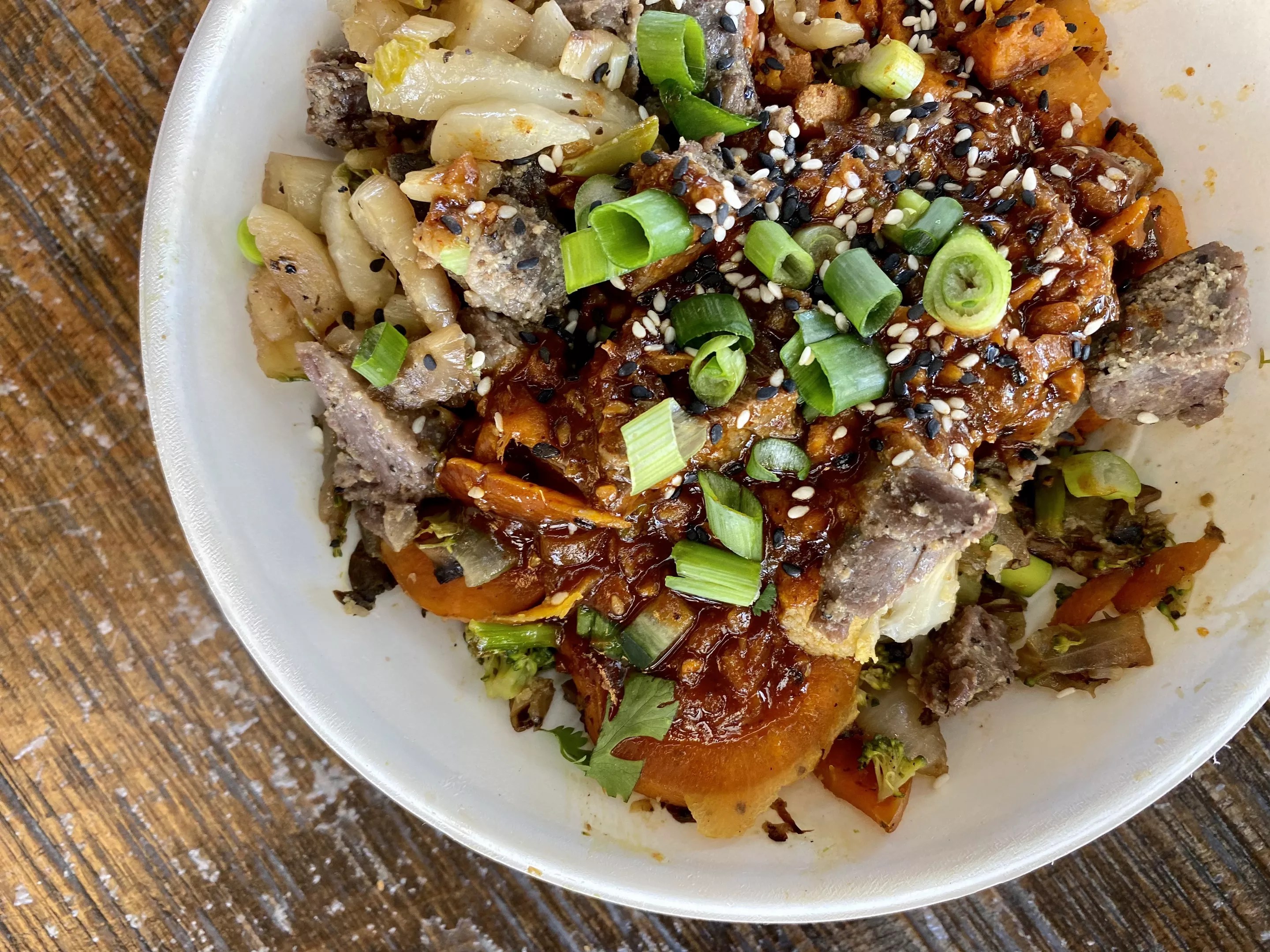 The Spicy Korean Steak Bowl with half brown rice and half sweet potato hash as its base.