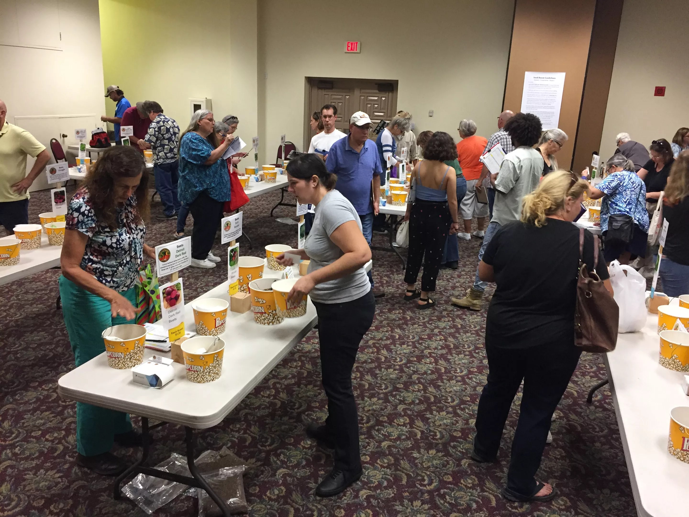 Those who attend the two-day seed-buying event can browse through about 80 to 100 varieties of seeds for vegetables, herbs, grains and wildflowers which are labeled by item and stored in bright yellow popcorn tubs.