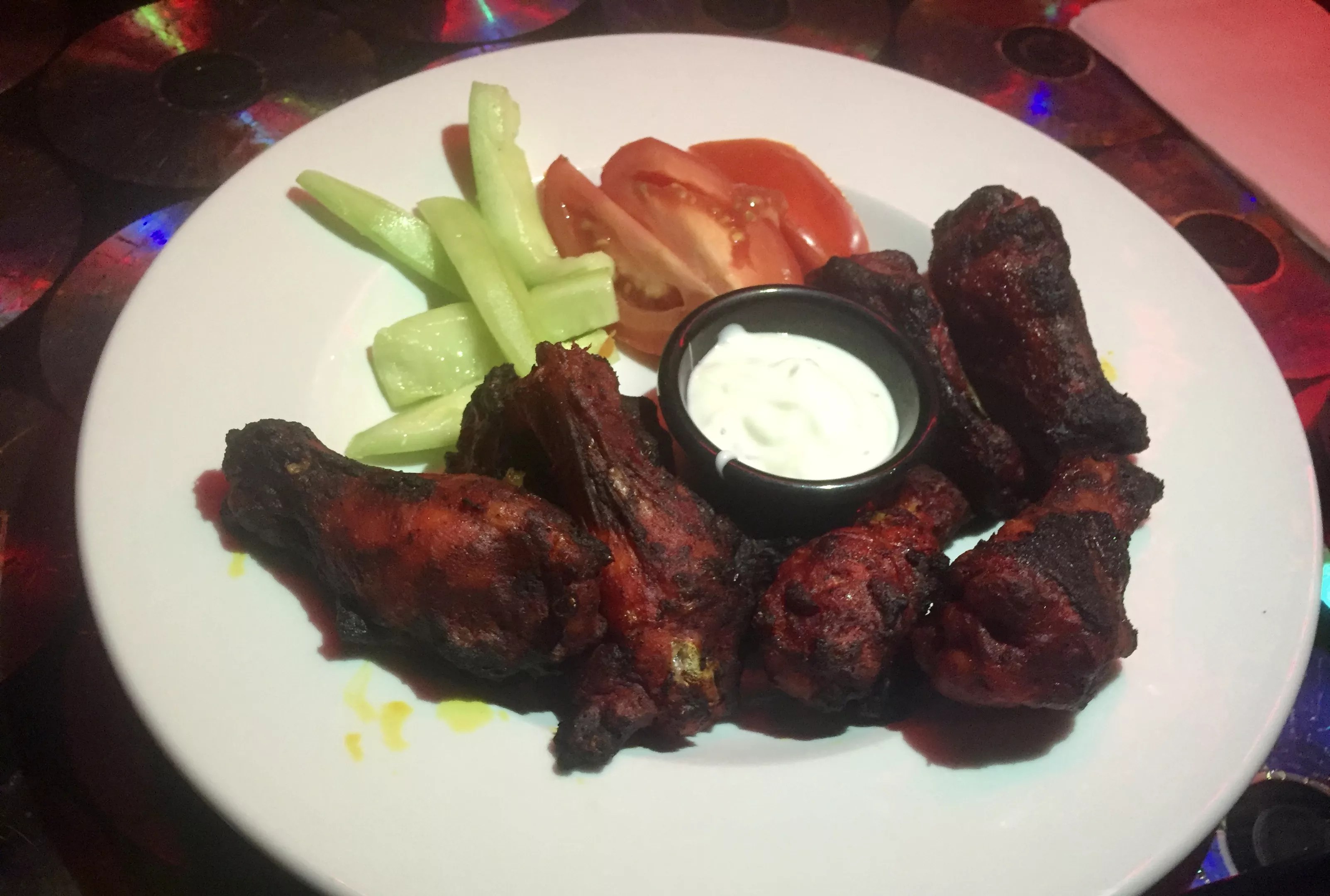 The oven-baked chicken tandoori wings from Cornish Pasty Co. are kind of a blackened dry rub offering from this well-loved pub. The darkened edges of each wing are crispy, and meat is fall-off-the-bone tender, and the tandoori flavor features a mild kick and a sneaky sweetness. The six or so wings come with cucumber and tomato slices, and a cup of lemon mint yogurt dip, which goes quick.