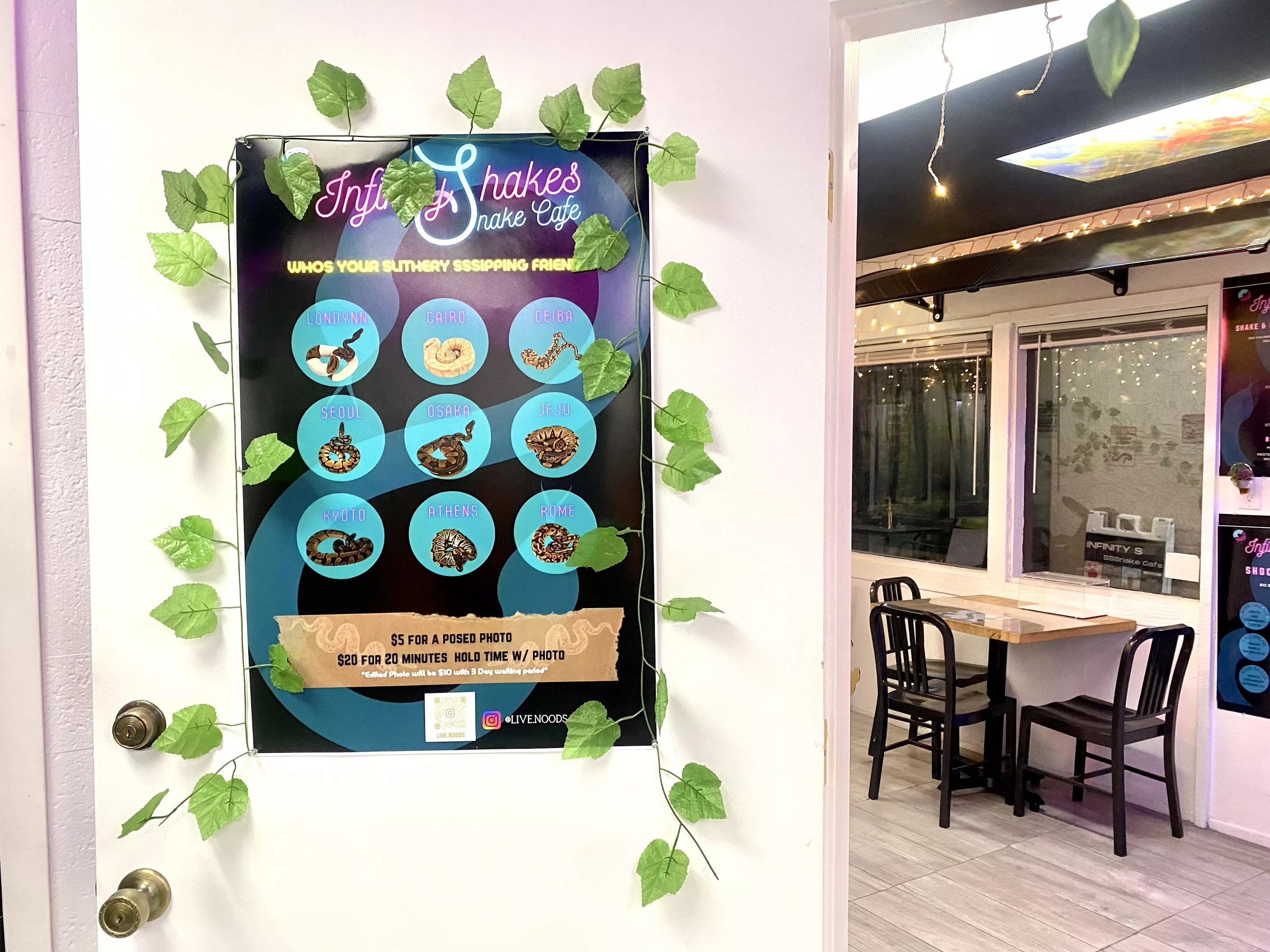 A sign above the door reads “Live Noodsss,” and leads into the unusual business. Inside, customers can hang out with snakes with names such as Osaka and Athens. On the drinks menu, protein shake flavors range from Cinnamon Toast Crunch to Fruity Pebbles and Oreo Overload.