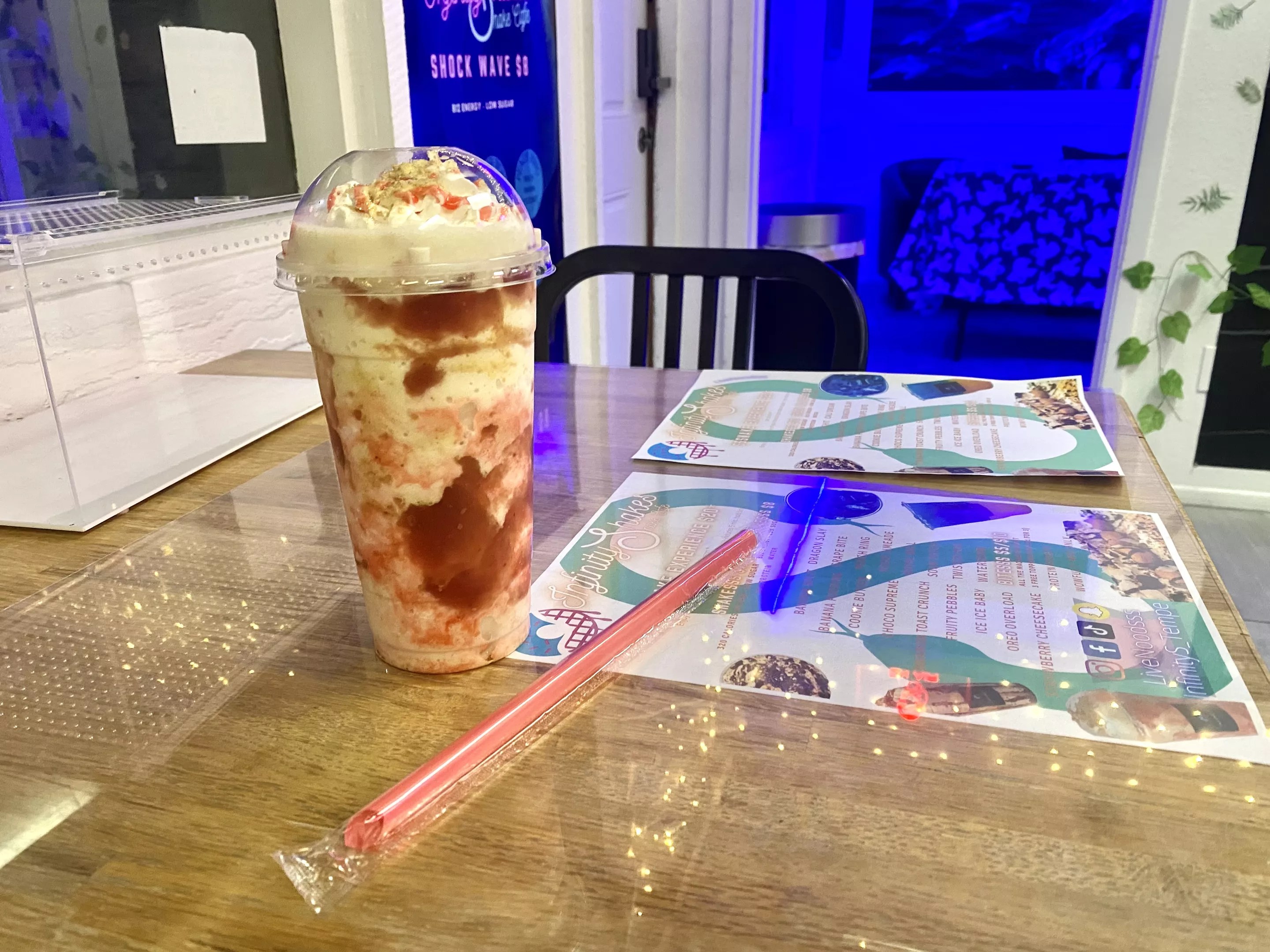 In an unassuming plaza off Rural Road in Tempe, snakes slither inside of a neon-lit room while strawberry cheesecake protein shakes are blended in an adjacent space. No, this isn’t a Halloween haunted house or a sci-fi reptilian dream. It’s Infinity Shakes Snake Cafe.