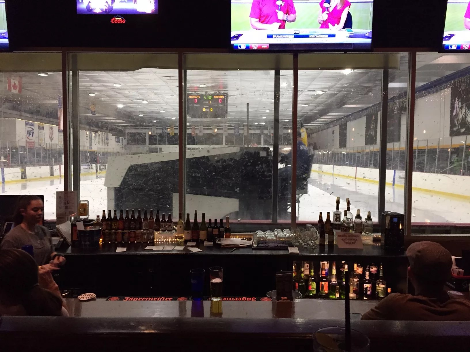 There is exposed cinder block and strings of market lights, now. The tiered double bar setup is more comfortable, and the booths that line the wall lend a sports bar feel. Someone also managed to rid the room of the musty melted ice smell that haunts the rest of the ice rink.