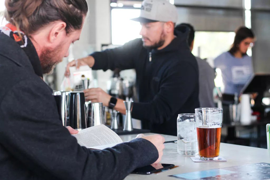 Reading contently with manager Moe Murillo making a drink at the bar.