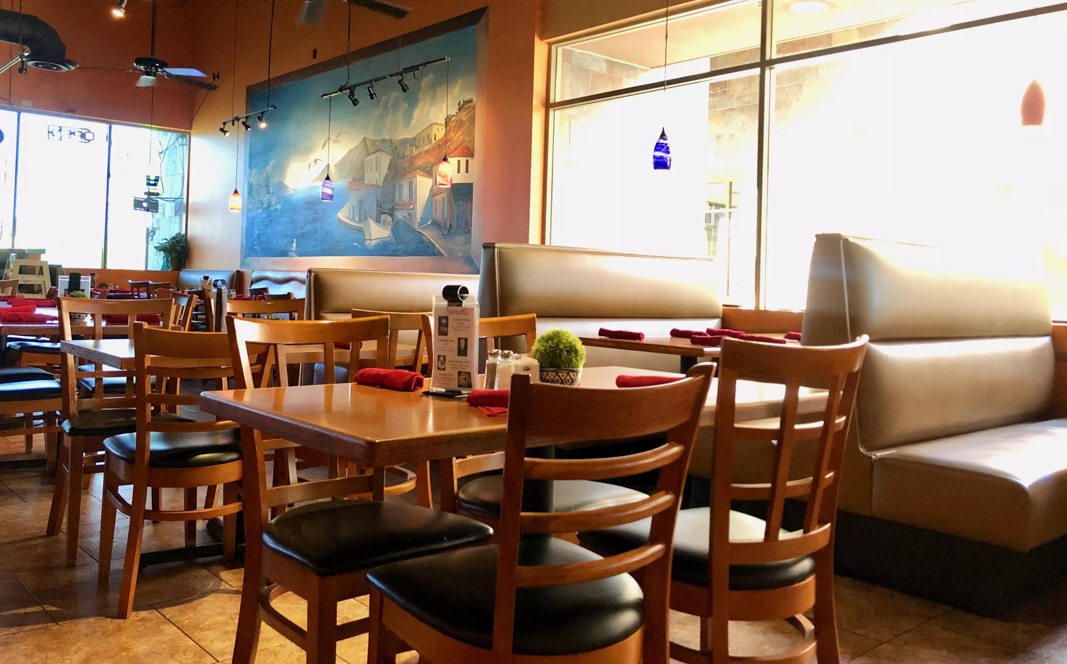 If it’s too hot for the patio, try to grab a seat by the seaside mural.