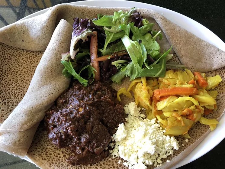 Stewed chicken, house-made cheese, cabbage, and greens on injera.