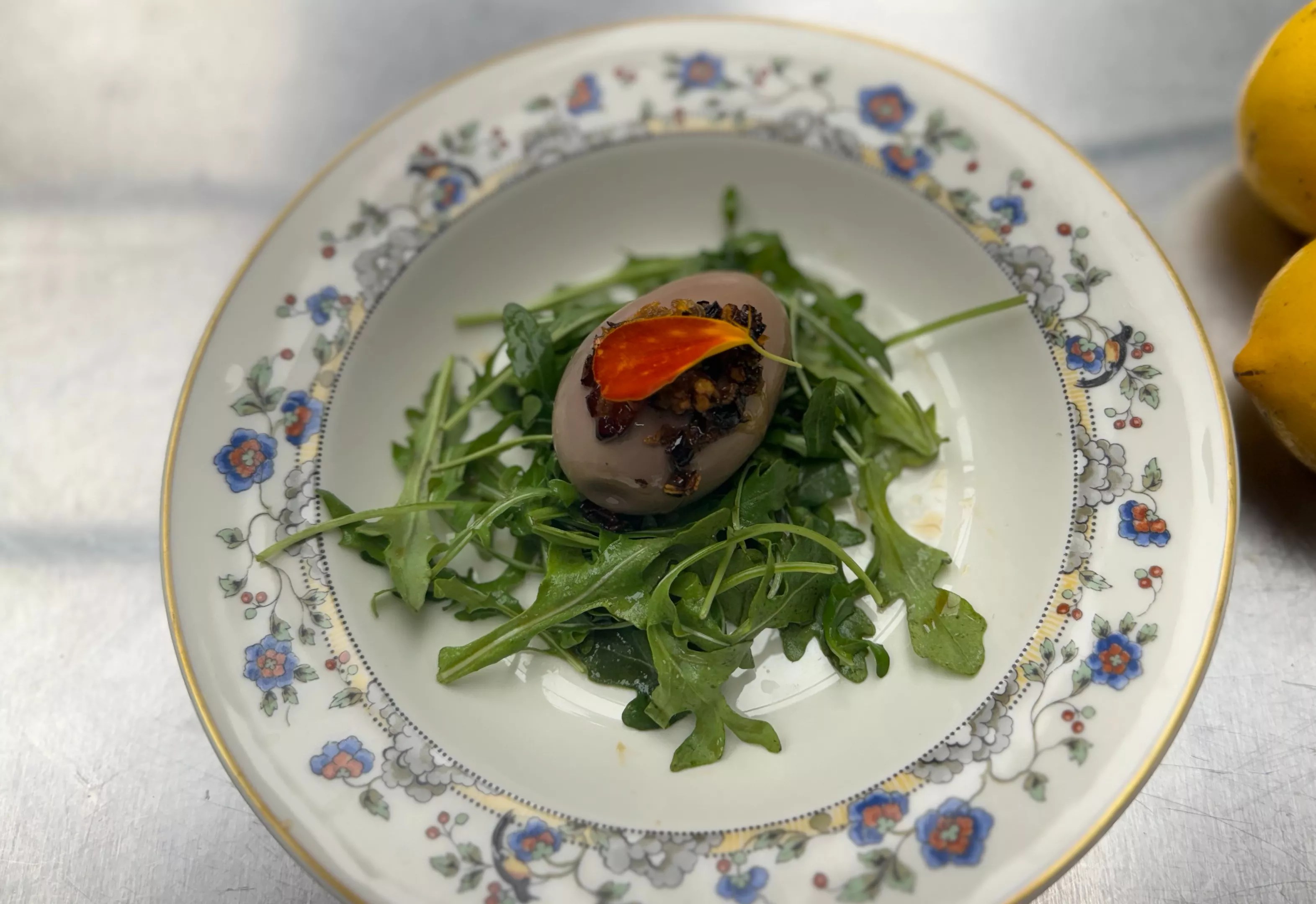 For the tea egg, Di Santo boils the egg and marinates it in soy, oolong tea, star anise, ginger and cinnamon. The egg is cured overnight and served nestled in a bed of greens and topped with housemade chile crisp.