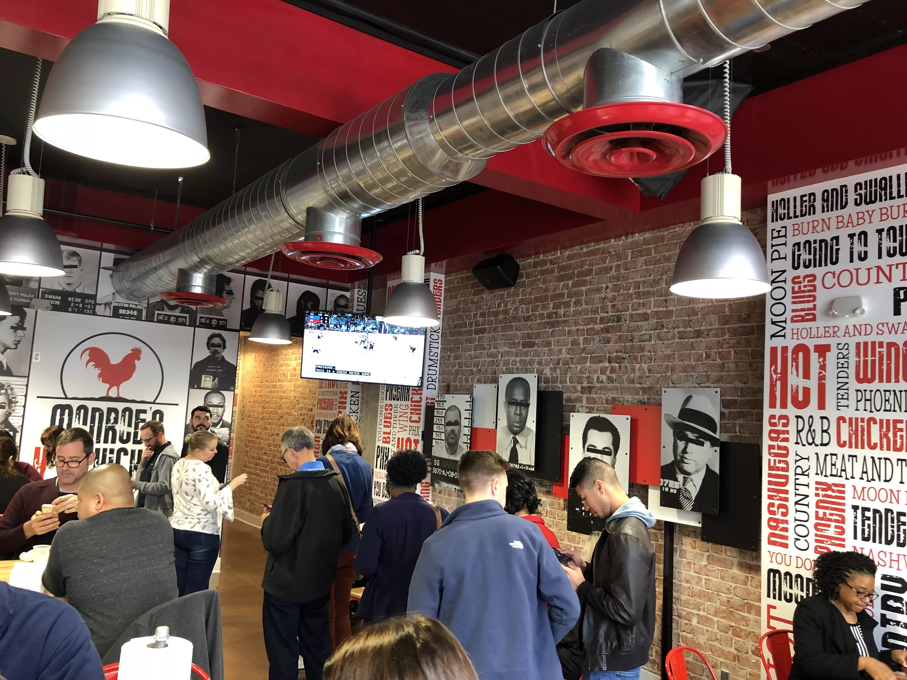 Monroe’s had a line 20 or so deep. That line moves fast. It carries you through a room with elevated fast food vibes and an elaborate landscape of industrial-chic vents, pipes, and lights on the ceiling. It hustles you by walls checker-boarded with eyes-covered mugshots of everybody from Pablo Escobar to Martin Luther King.