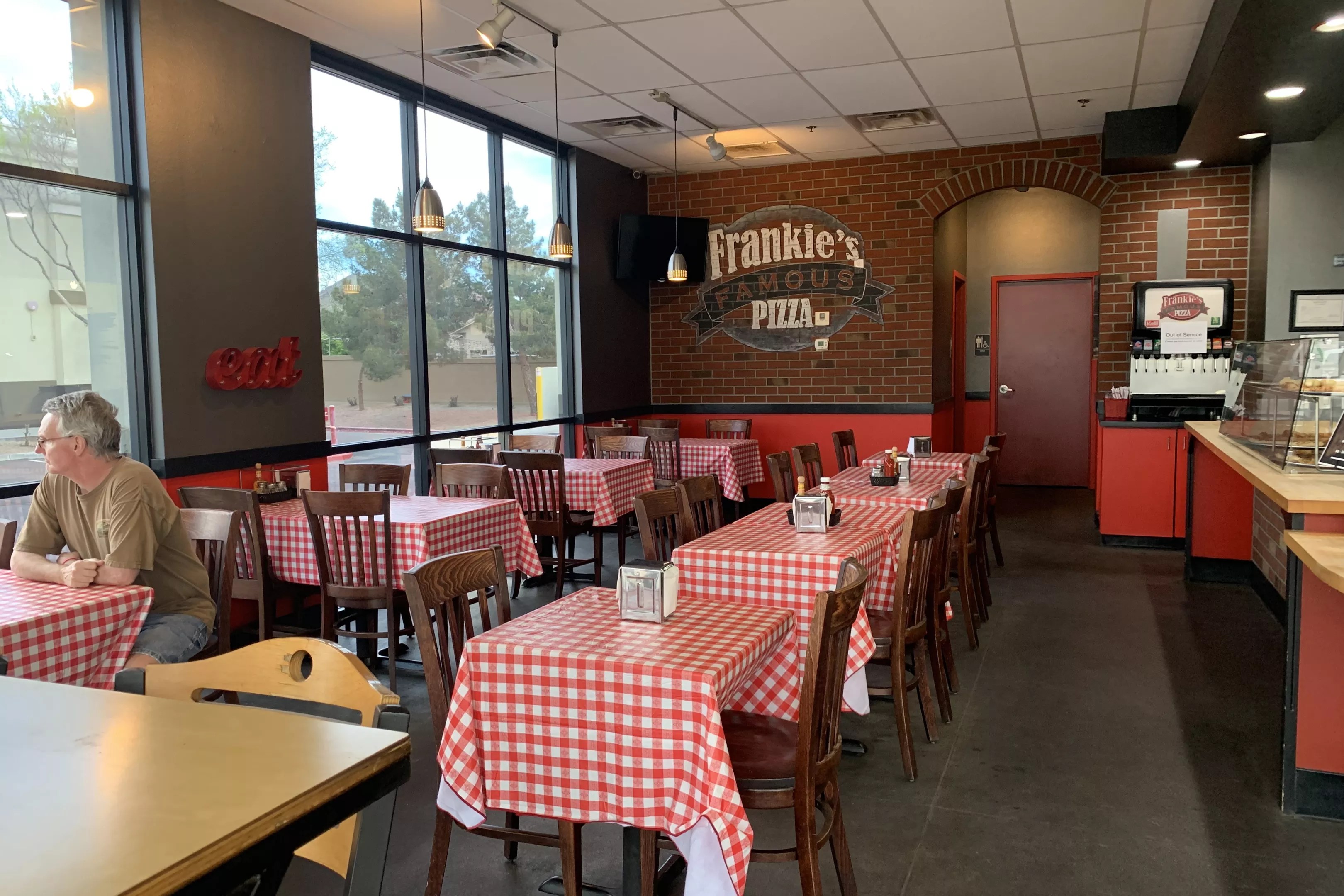 The Frankie’s Famous Pizza dining room, complete with new tablecloths.